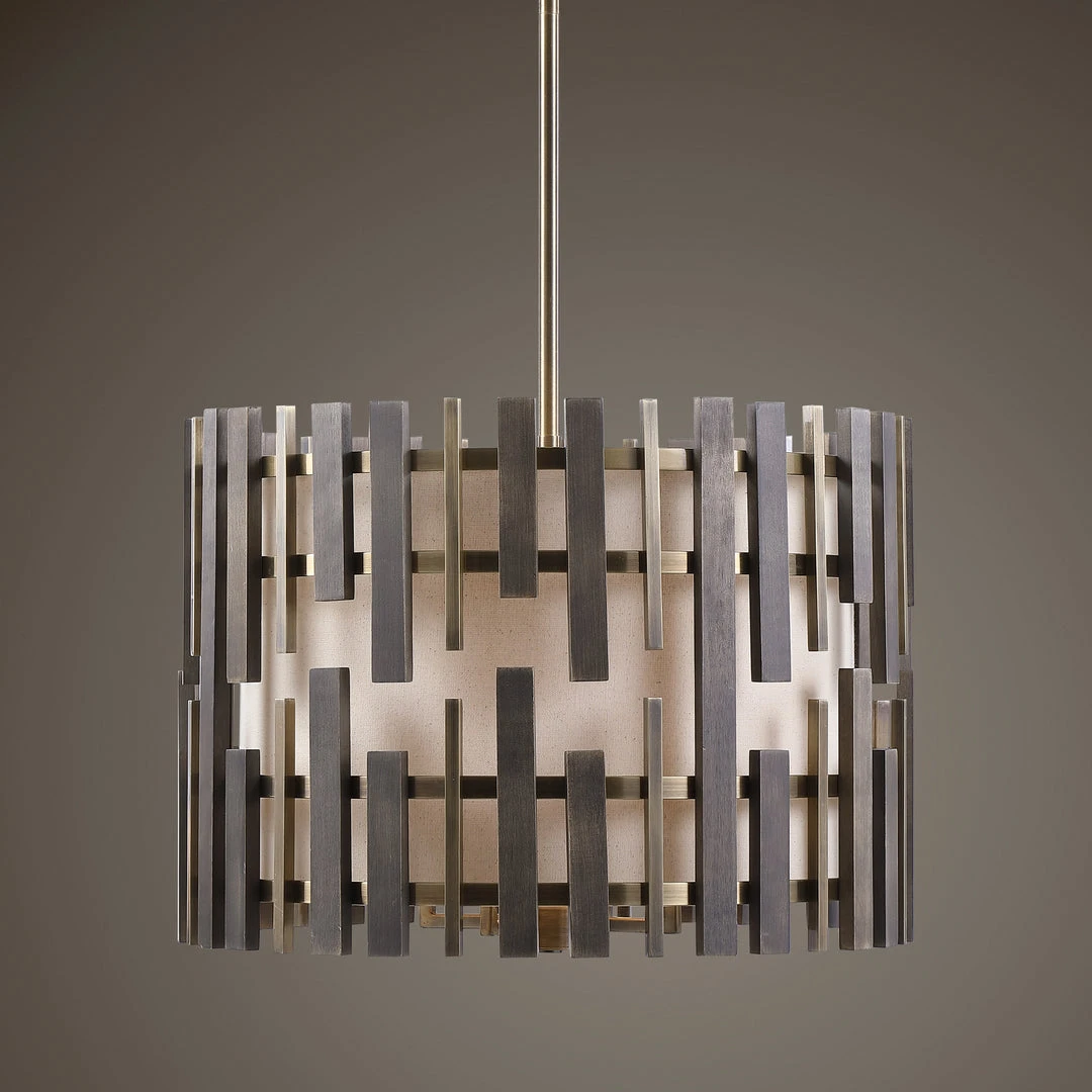 Vertical Wood Bars In A Warm Grey Finish Mix With Antique Brass Bars To Give The Outer Shade Of Our 4 Lt. Pendant Great Detail. The Inner Hard Back Shade Is An Accent Of Cream Linen Fabric. 4-60 Watt Max, Candelabra Sockets. Supplied With 15 Wire, 3-12″ Stems, And 1-6″ Stem For Adjustable Installation.