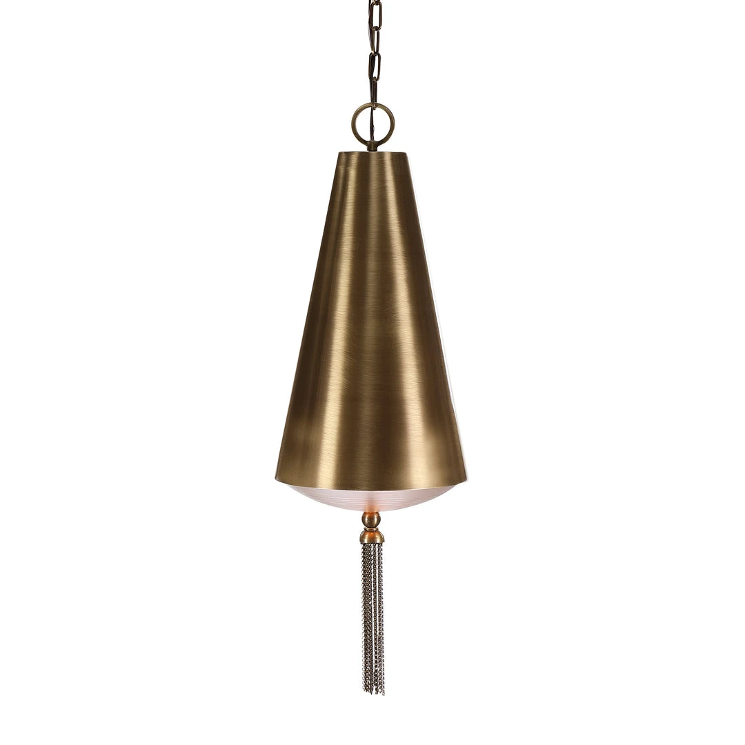 Exotic Chain Hung 1 Lt. Pendant With A Flared Cone Shade In Antique Brass With Convex Concentric Circle Glass Diffuser And A Wonderful Antique Brass Oversized Tassel Finial. 1-100 Watt Max, Edison Socket. Includes 12’ Wire & 5 Chain For Adjustable Installation.