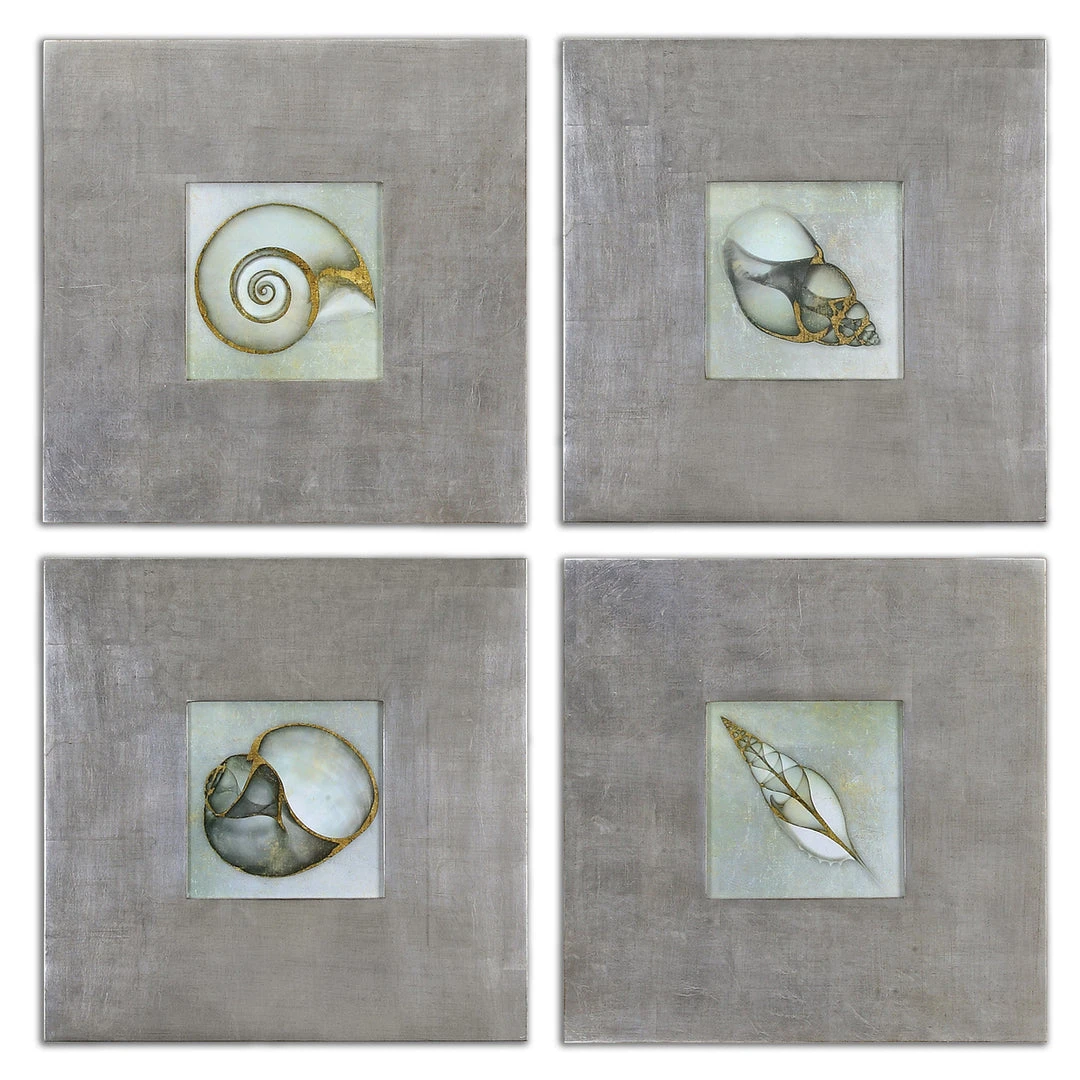 A Contemporary, Coastal Style Is Showcased By These Nautical Shells. Each Print Features A Sea Foam Green And Gray Color Palette With Bright Gold Leaf Accents. An Oversized, Champagne Silver Leaf Frame With A Light Brown Glaze Completes Each Piece Of Art. Each Print Is Placed Under Protective Glass.