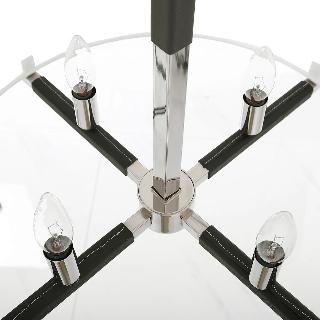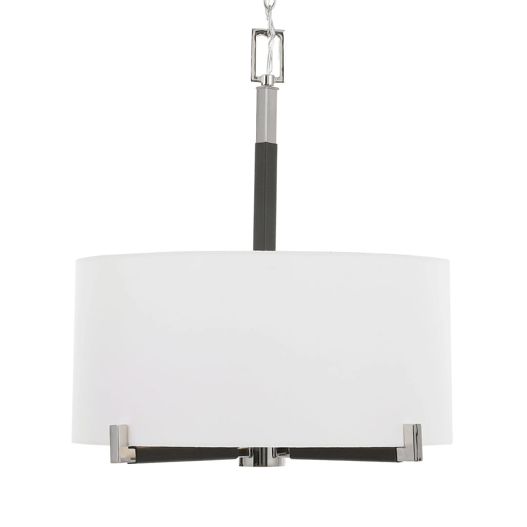 Clean Transitional Look Of White Fabric Hard Back Shade With Polished Nickel And Further Enhanced With Hand Sewn Textured Black Leather Accents. 4-60 Watt Max, Candelabra Sockets. Supplied With 20 Wire, And 5 Chain For Adjustable Installation.