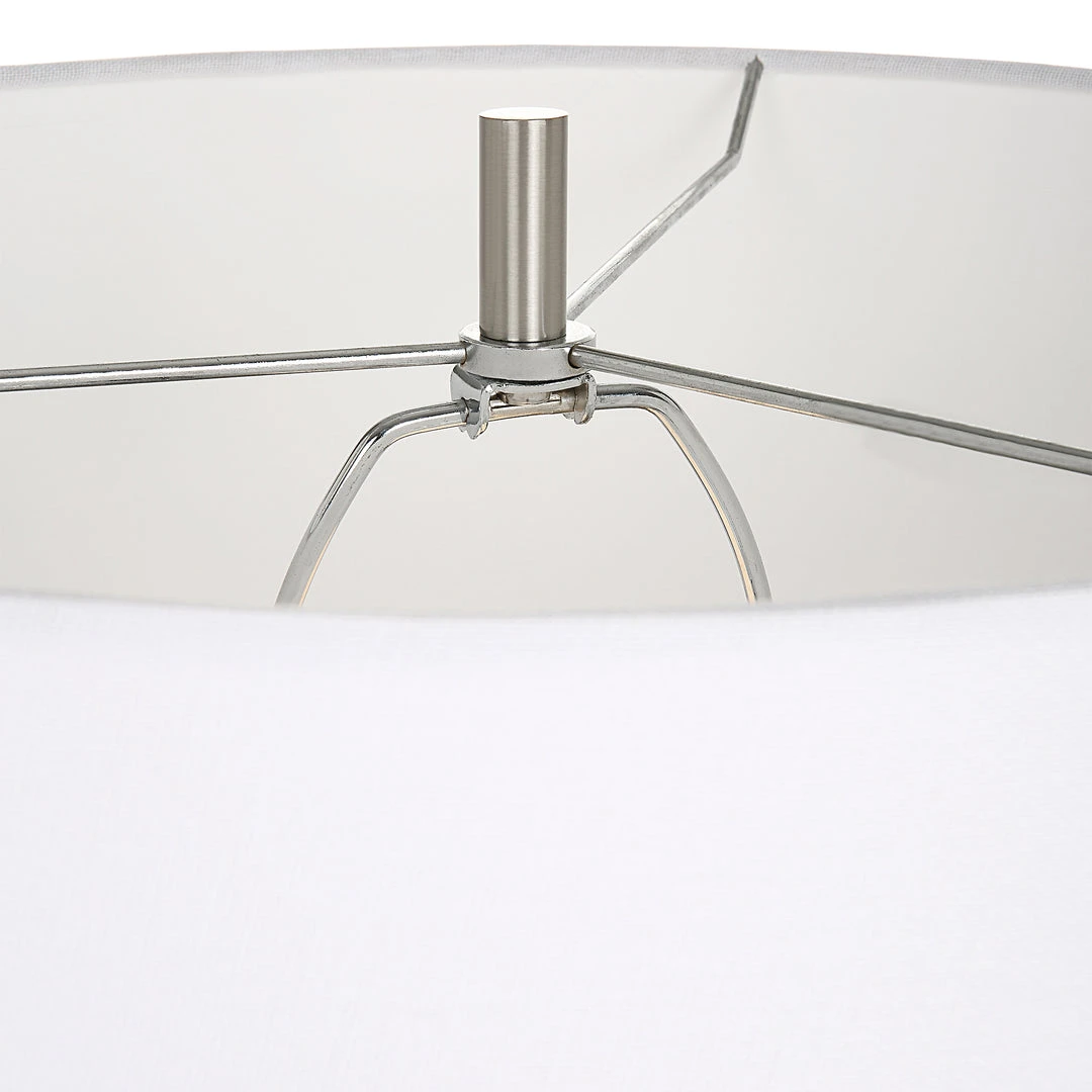Finished In A Distressed Deep Cobalt Blue Glaze With Subtle White Undertones, This Table Lamp Features A Textured Ceramic Base With Iron Details Finished In Brushed Nickel Displayed On An Elegant Crystal Foot. The Lamp Is Complimented By A White Linen Drum Shade.