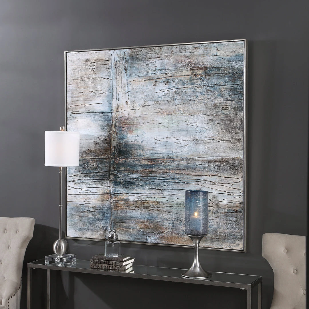 Hand Painted On Canvas, This Abstract Artwork Showcases A Heavily Textured Finish. Shades Of Teal, Green, And Light Blue Are Accented By Neutral Gray, Tan, And Charcoal Tones. An Antiqued Silver Leaf Gallery Frame Completes This Piece. Due To The Handcrafted Nature Of This Artwork, Each Piece May Have Subtle Differences. This Piece May Be Hung Horizontal Or Vertical.
