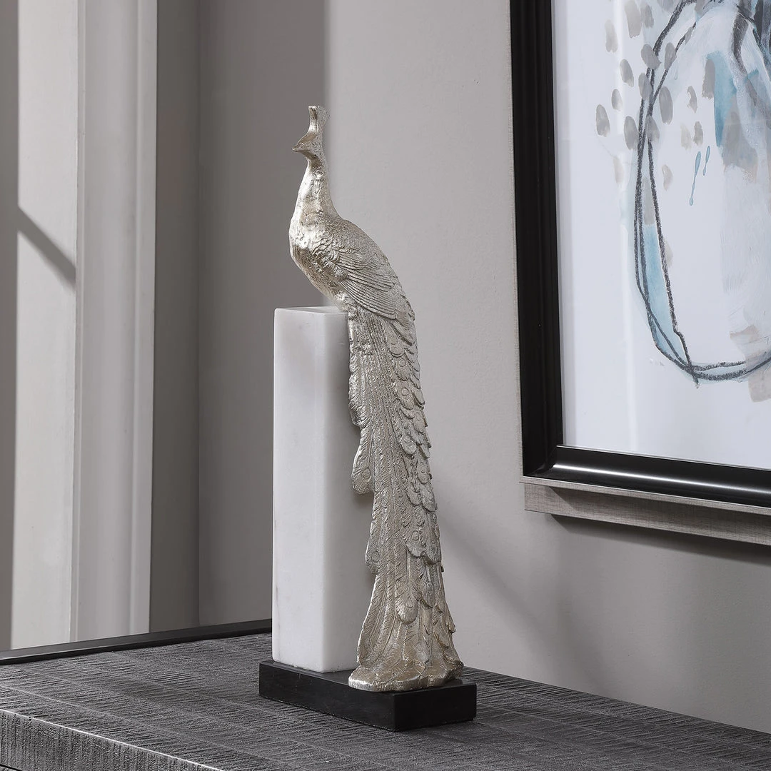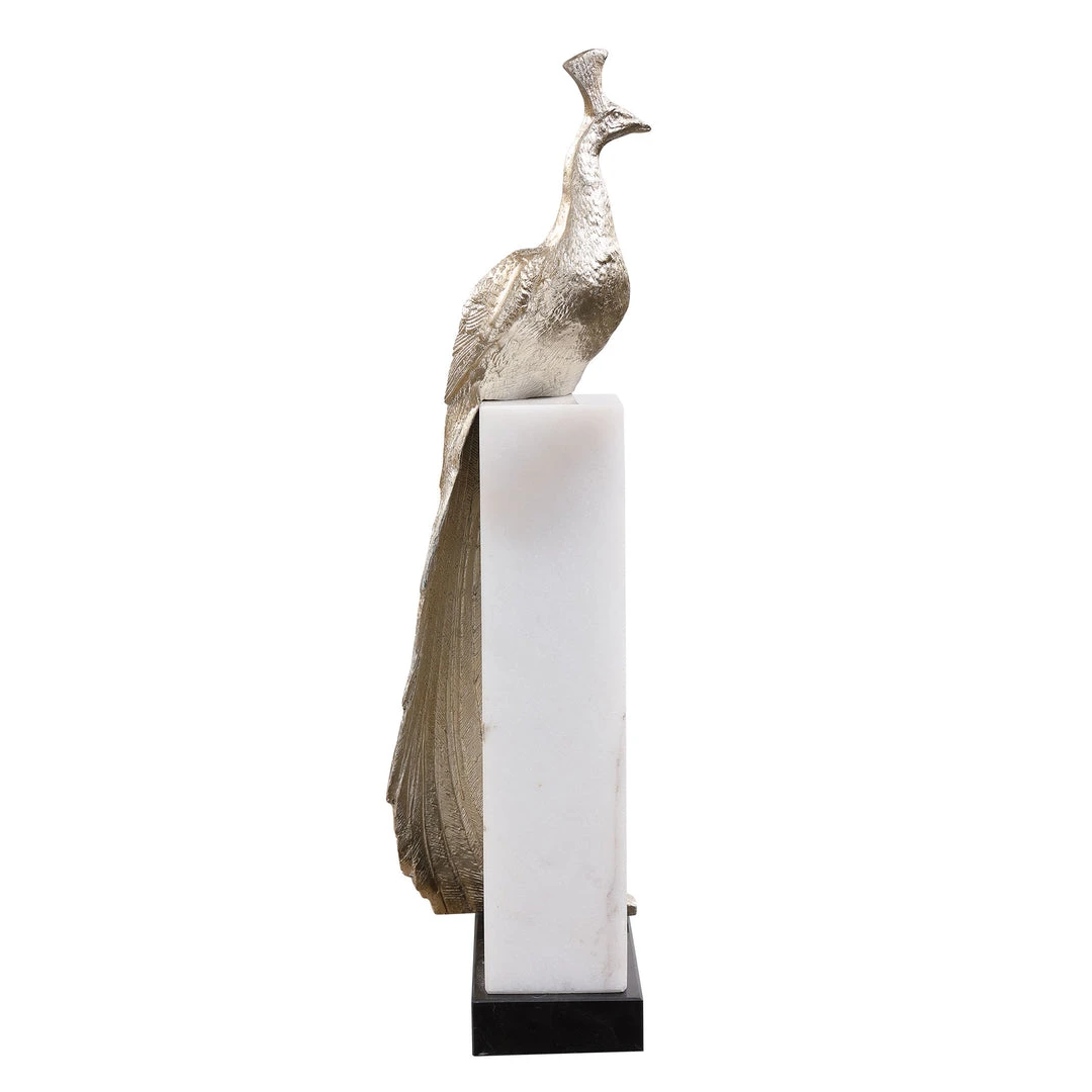 Traditional And Elegant, This Peacock Sculpture Features A Champagne Silver Bird Atop A White Marble Column With A Black Marble Base.