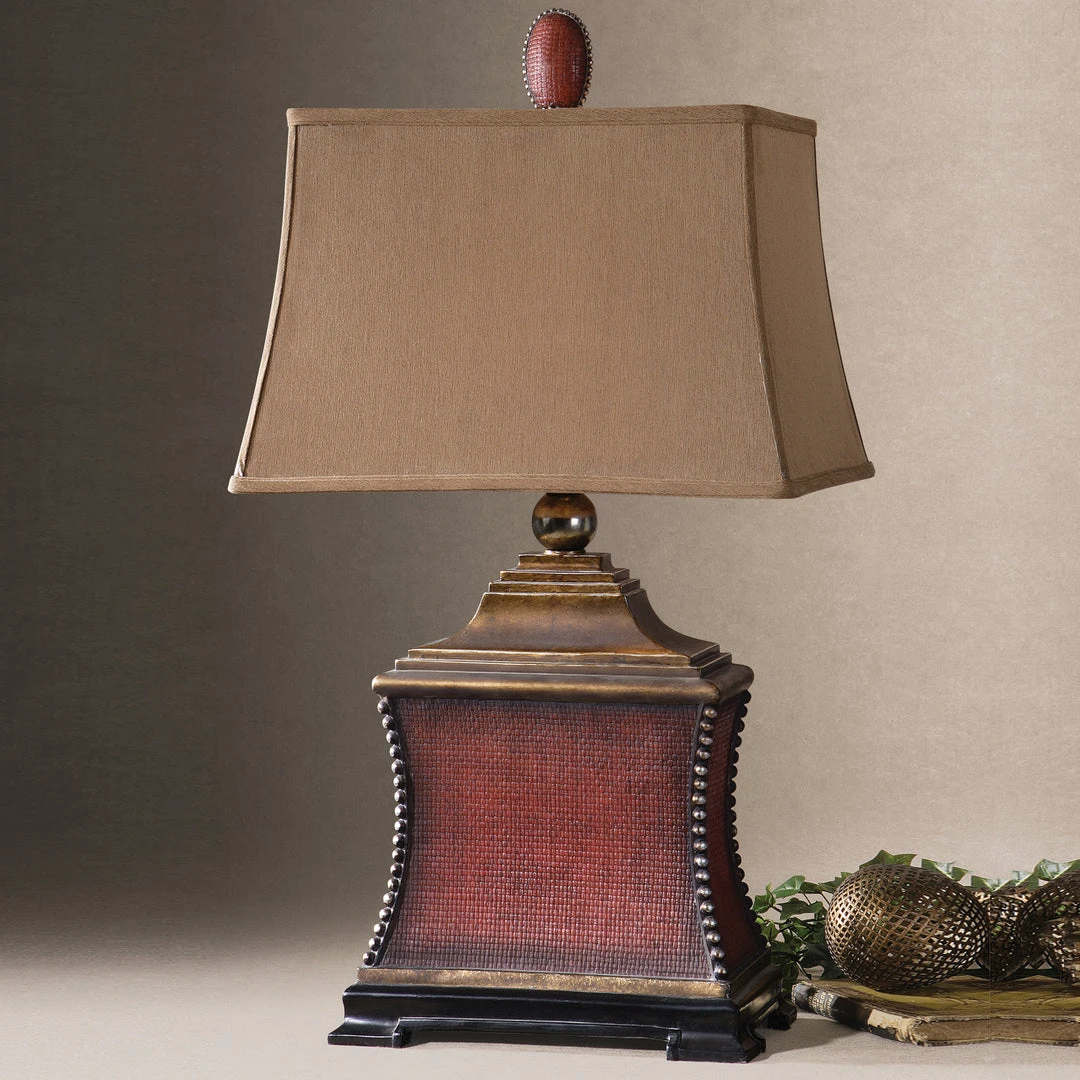 Aged Red Finish Over A Woven Textured Base With Antiqued Silver Beaded Accents, Matte Black Foot And Heavily Antiqued Gold Details. The Rectangle, Semi Bell Shade Is A Silken Rust Taupe Fabric.