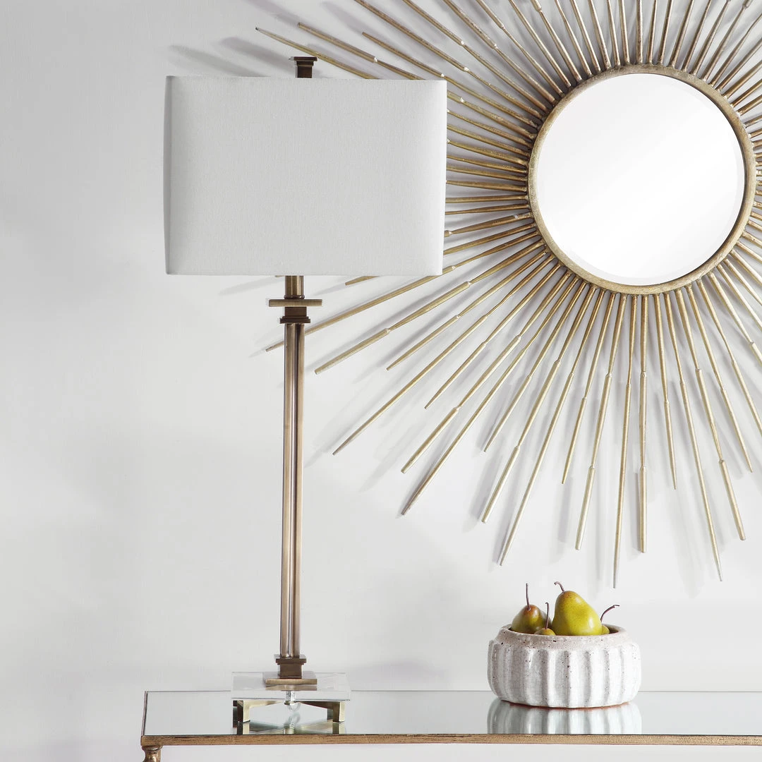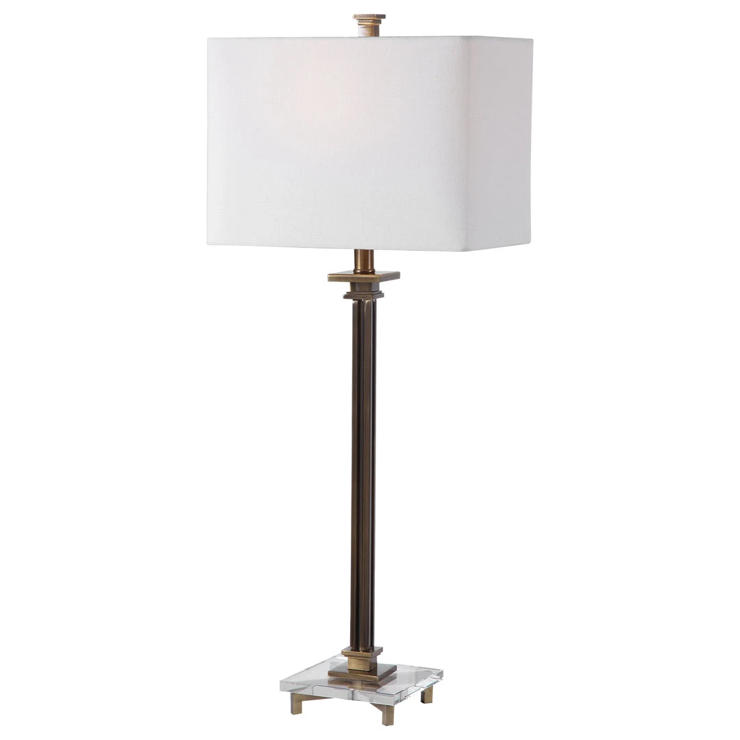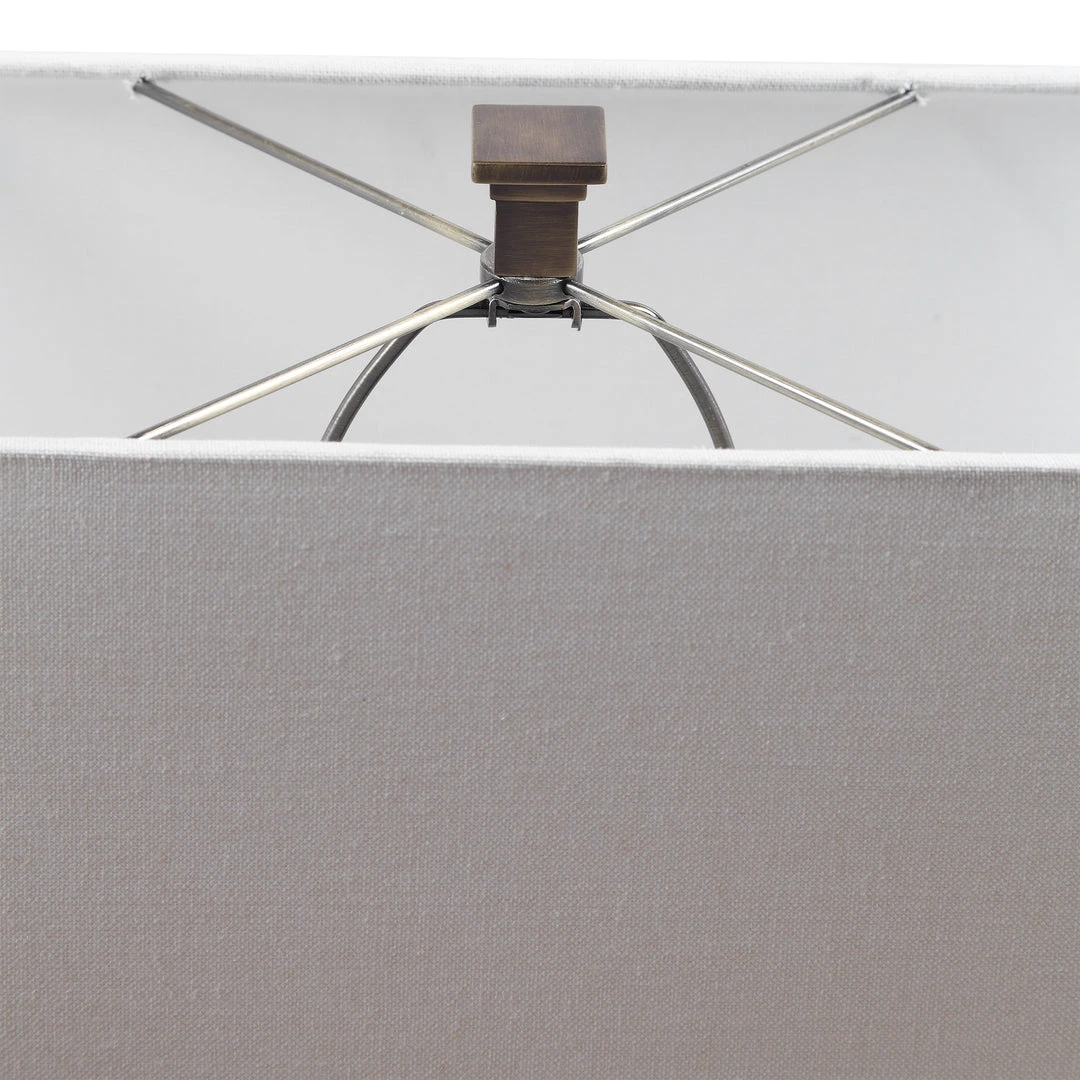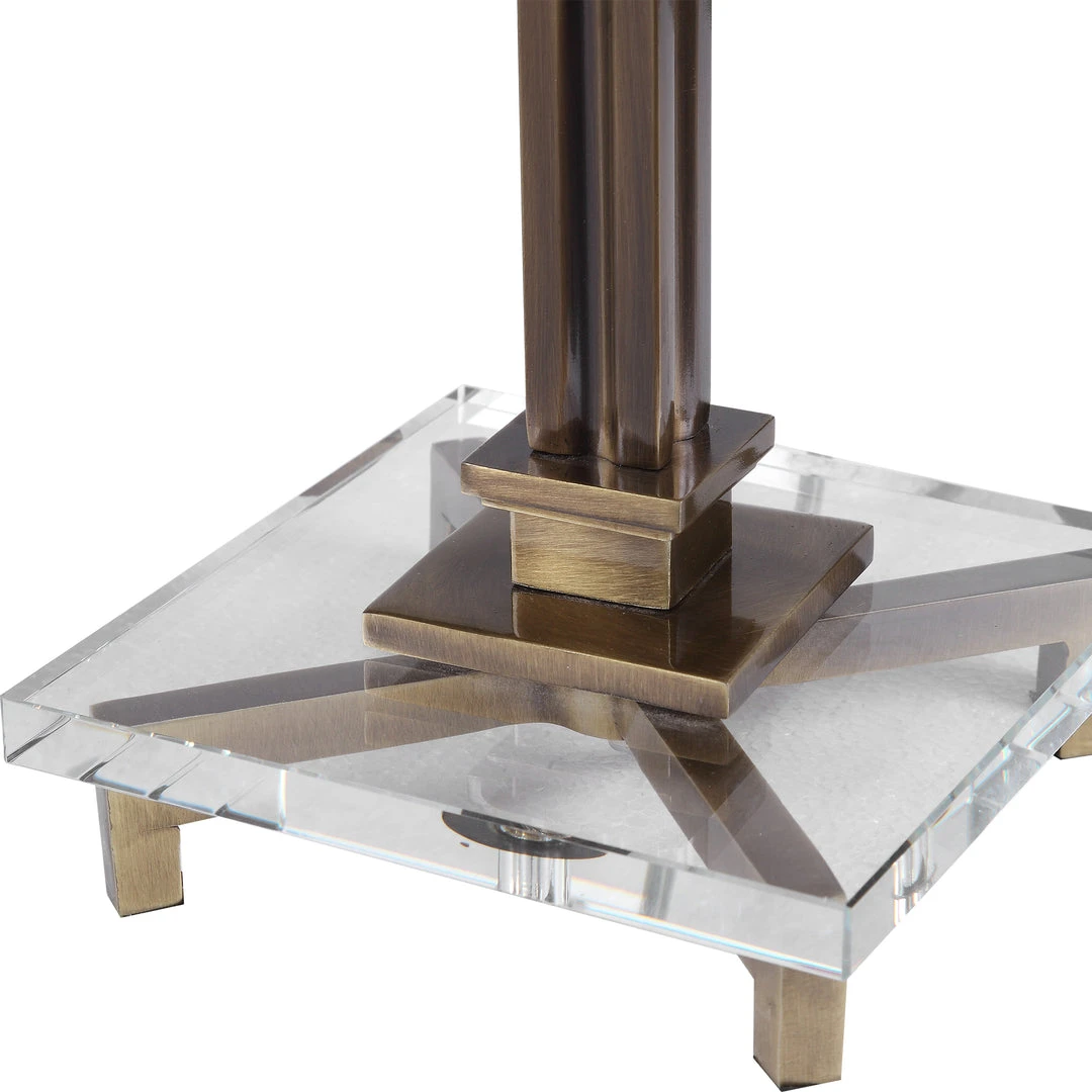 Add A Touch Of Updated Traditional Style To A Space With This Table Lamp. The Metal Base Features A Fluted Design Finished In A Plated Antique Brass, Accented With A Thick Piece Of Elegant Crystal. The Rectangle Hardback Shade Is A White Linen Fabric.