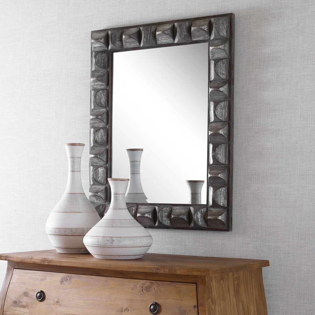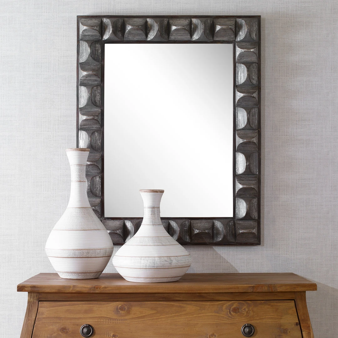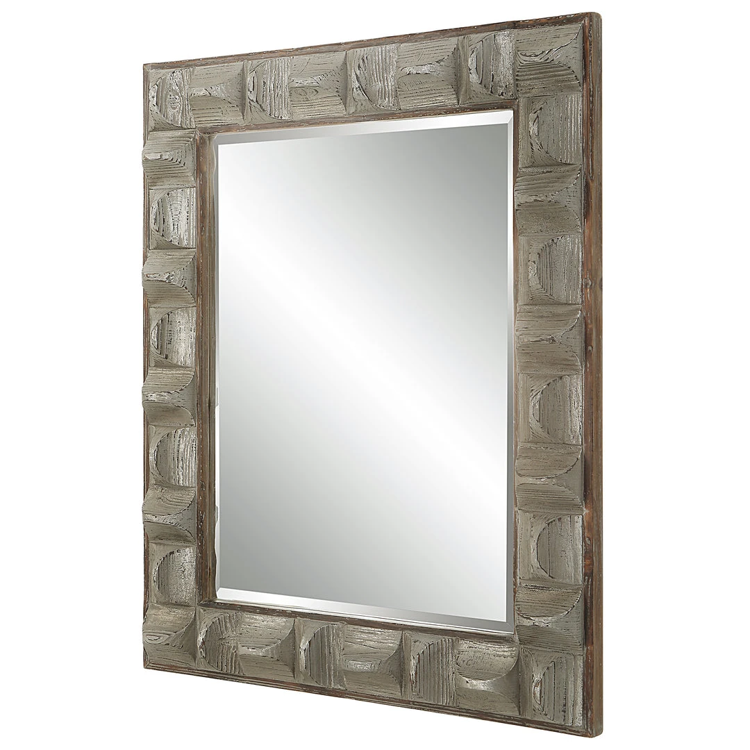 A Contemporary Take On Rustic Decor, This Rectangular Mirror Features 3-dimensional Scooped Fir Wood Blocks With A Distressed, Aged Gray Wash And Silver Highlights. The Outer Frame And Inner Fillet Are Naturally Finished With Distressed Details. The Mirror Has A 1 1/4″ Bevel And May Be Hung Horizontal Or Vertical.