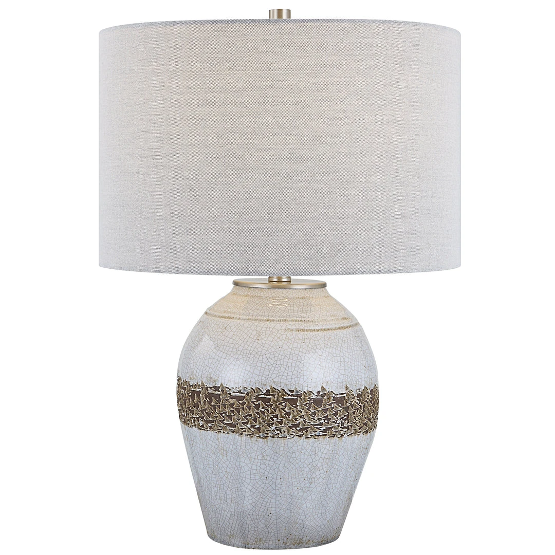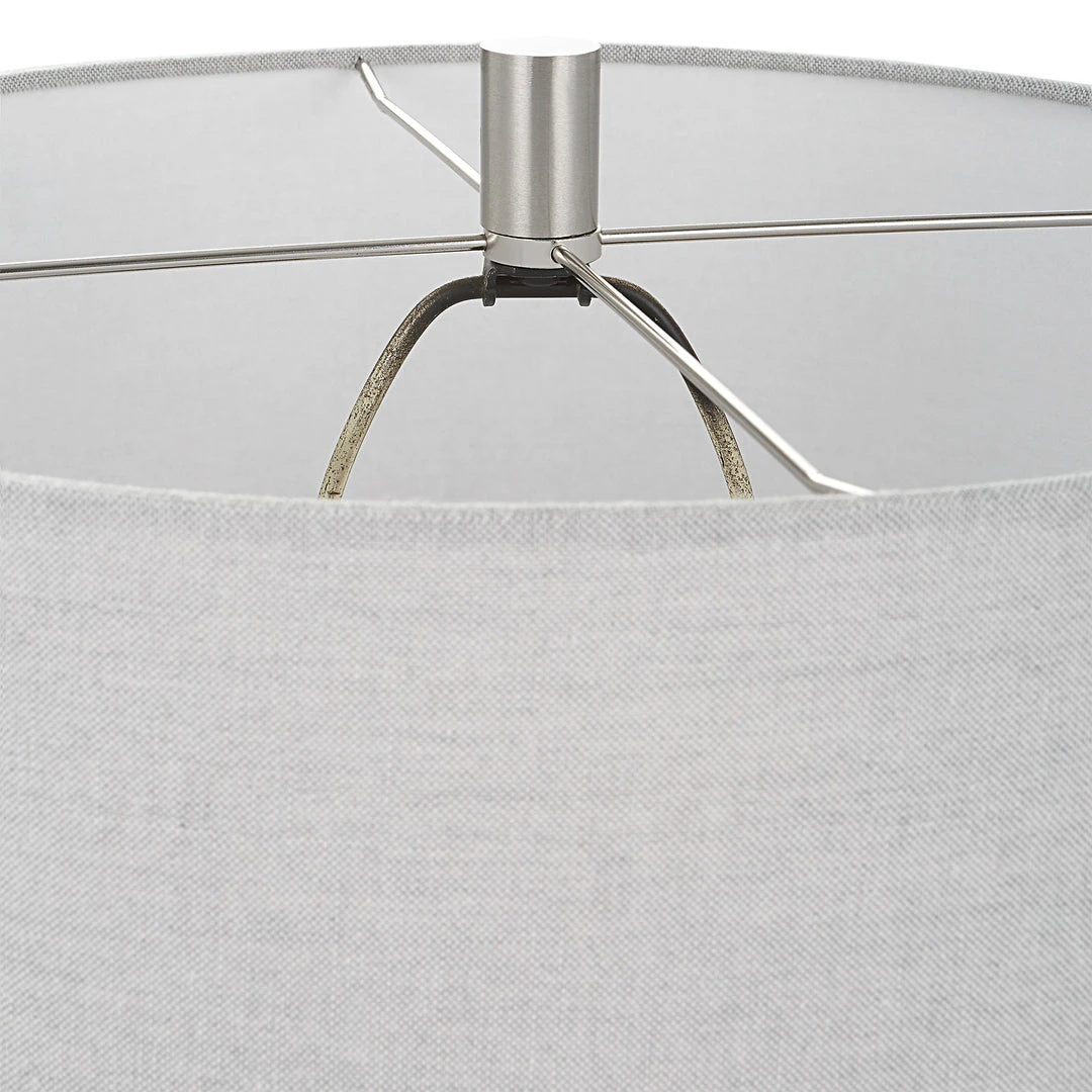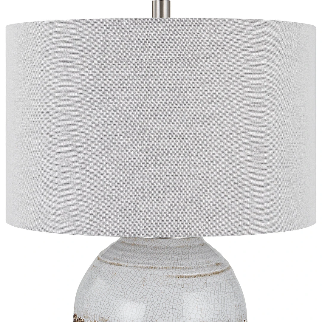 Inspired By Antique Handcrafted Pottery, This Ceramic Table Lamp Is Finished In A Distressed Light Gray Crackle Glaze With Rust Brown Textured Detailing And Brushed Nickel Plated Accents. The Hardback Drum Shade Is Covered In A Light Gray Linen Fabric.
