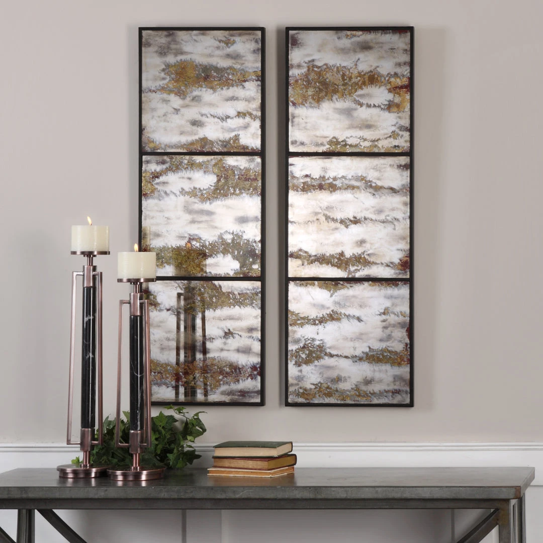 Each Panel Features Three Mirrors With A Heavily Oxidized, Antiqued Mirror In Deep Earth Tones. May Be Hung Horizontal Or Vertical.