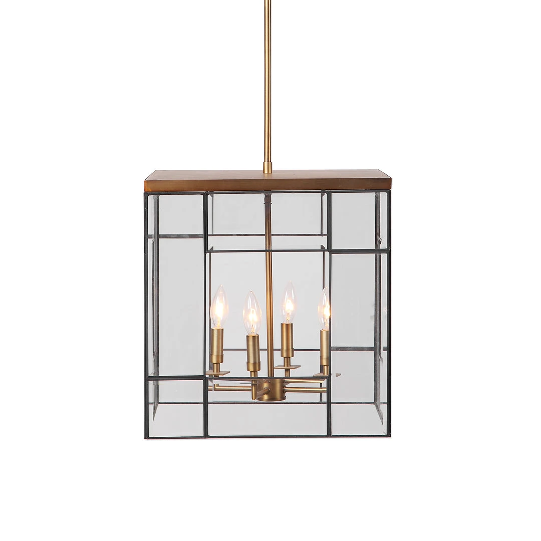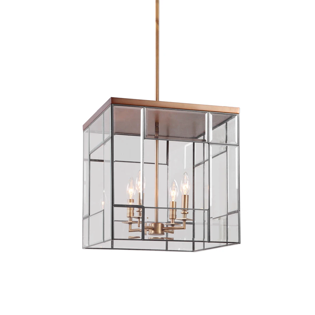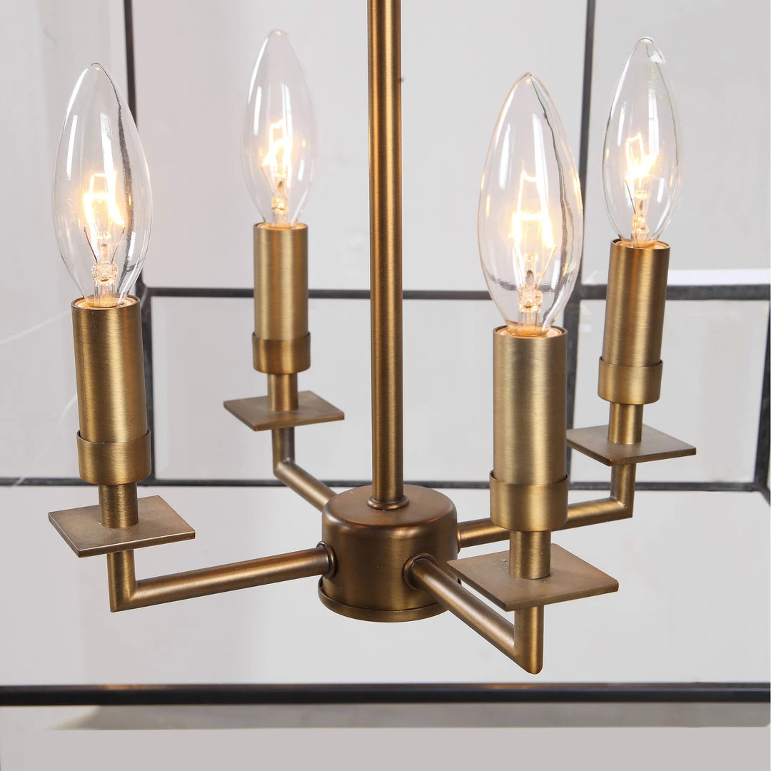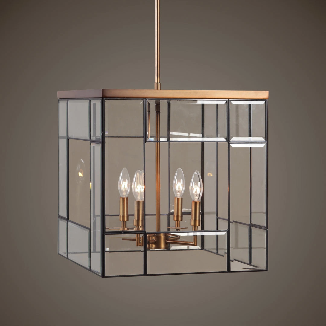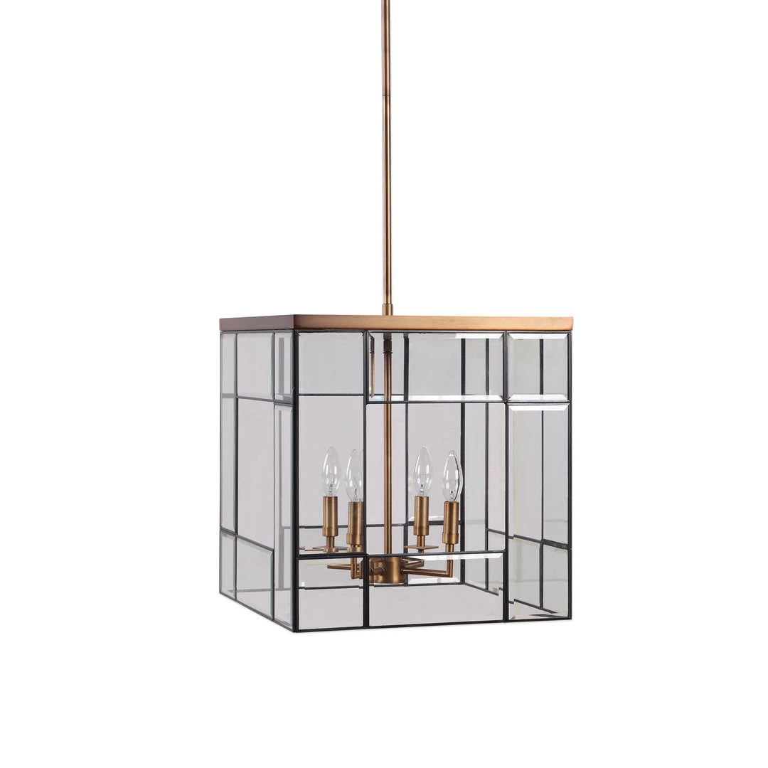 Geometric Clean Lines Make Up This Open Frame Rod Hung 4 Lt. Pendant In A Warm Antique Brass Finish Featuring Panels Of Clear Leaded Beveled Glass. With 4-60 Watt Max Candelabra Sockets And Supplied With 15wire And 3-12″stems & 1-6″ Stem For Adjustable Installation.