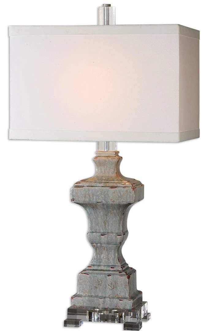 Textured Ceramic Finished In A Distressed Light Blue Glaze With Rust Undertones And An Acrylic Foot. The Rectangle Hardback Shade Is A White Linen Fabric.