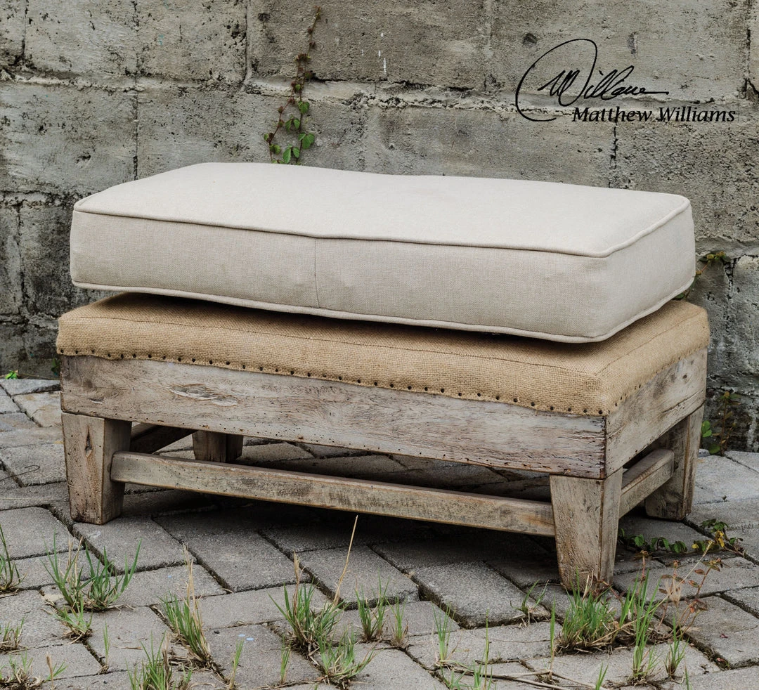 Solid Mahogany Hardwood, Bone White Frame, Neatly Tailored In Soft, Neutral Linen With Traditional Upholsterers Tacks Edging The Tan Burlap Deck. Matching Chair Is #23615.