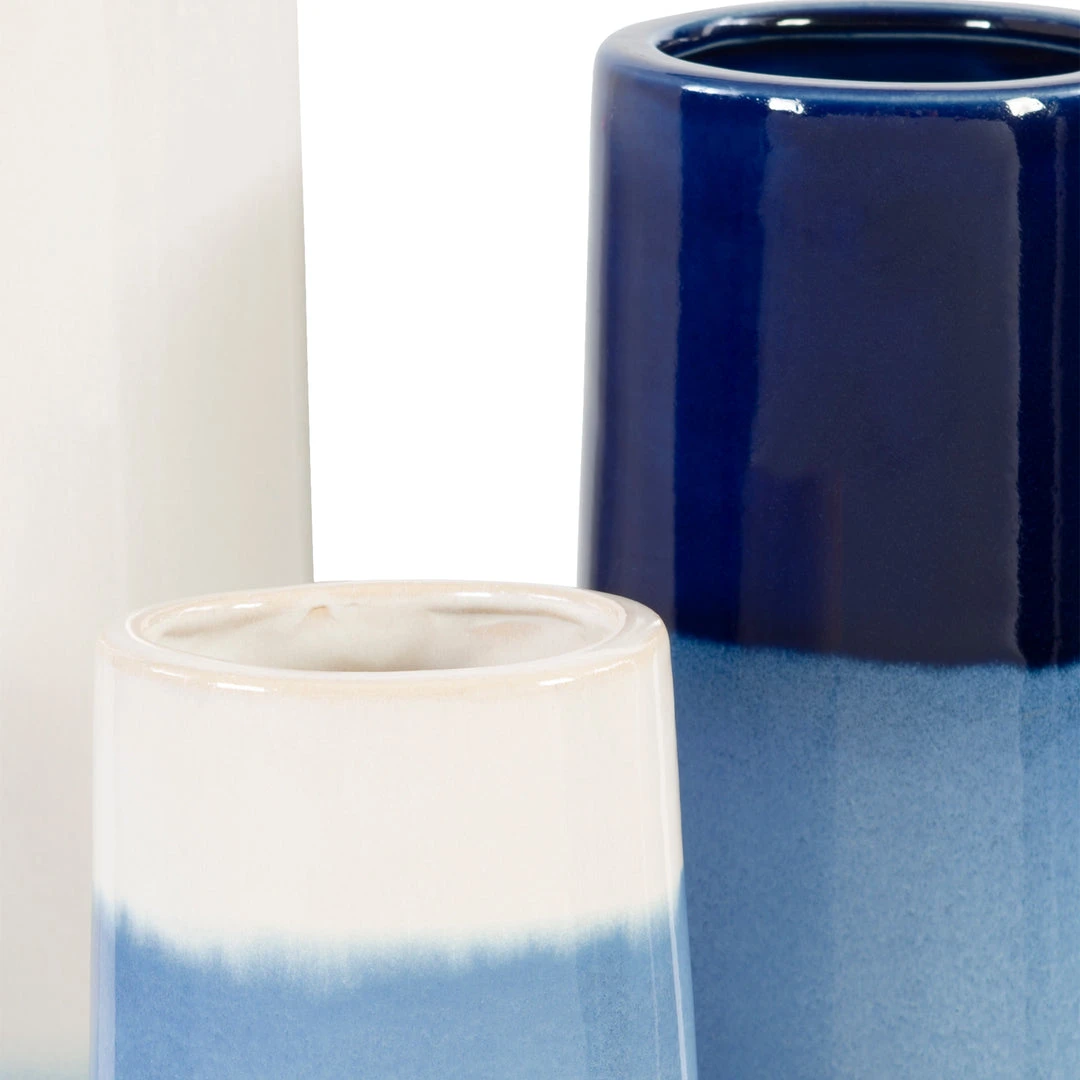 Set Of Three Earthenware Vases With Alternating Off-white, Light Blue, And Navy Glazes. Sizes: S-5x18x4, M-4x20x4, L-5x24x5