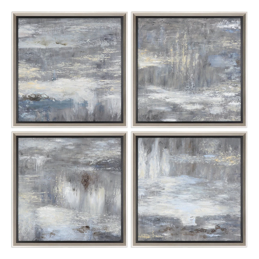 Hand Painted On Canvas, This Artwork Presents Modern, Contemporary Style. Moody Shades Of Slate Blue And Gray Give These Pieces Peaceful, Yet Expressive Quality. A Petite, Antiqued Silver Leaf Frame With A Satin Finish And A Black Inner Lip Complete Each Piece. Due To The Handcrafted Nature Of This Artwork, Each Piece May Have Subtle Differences.
