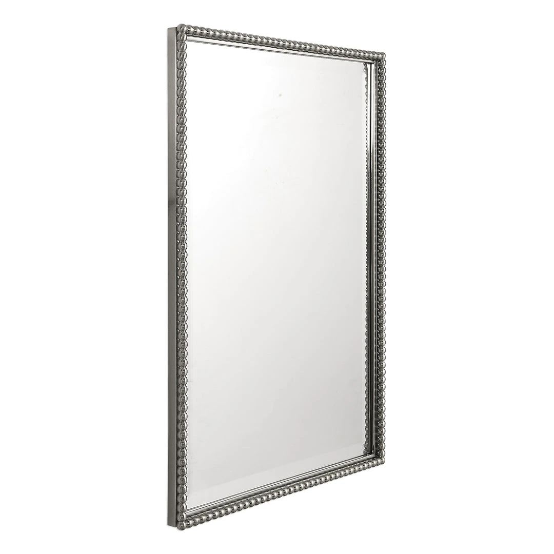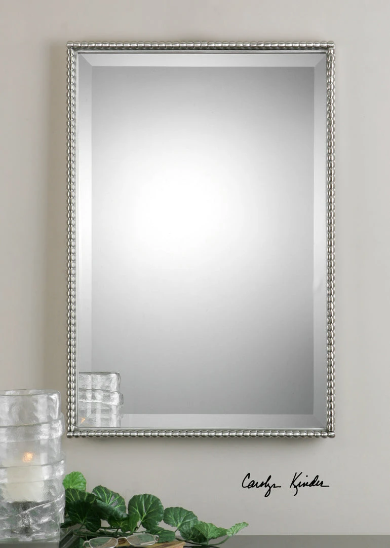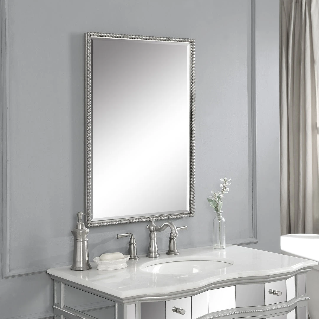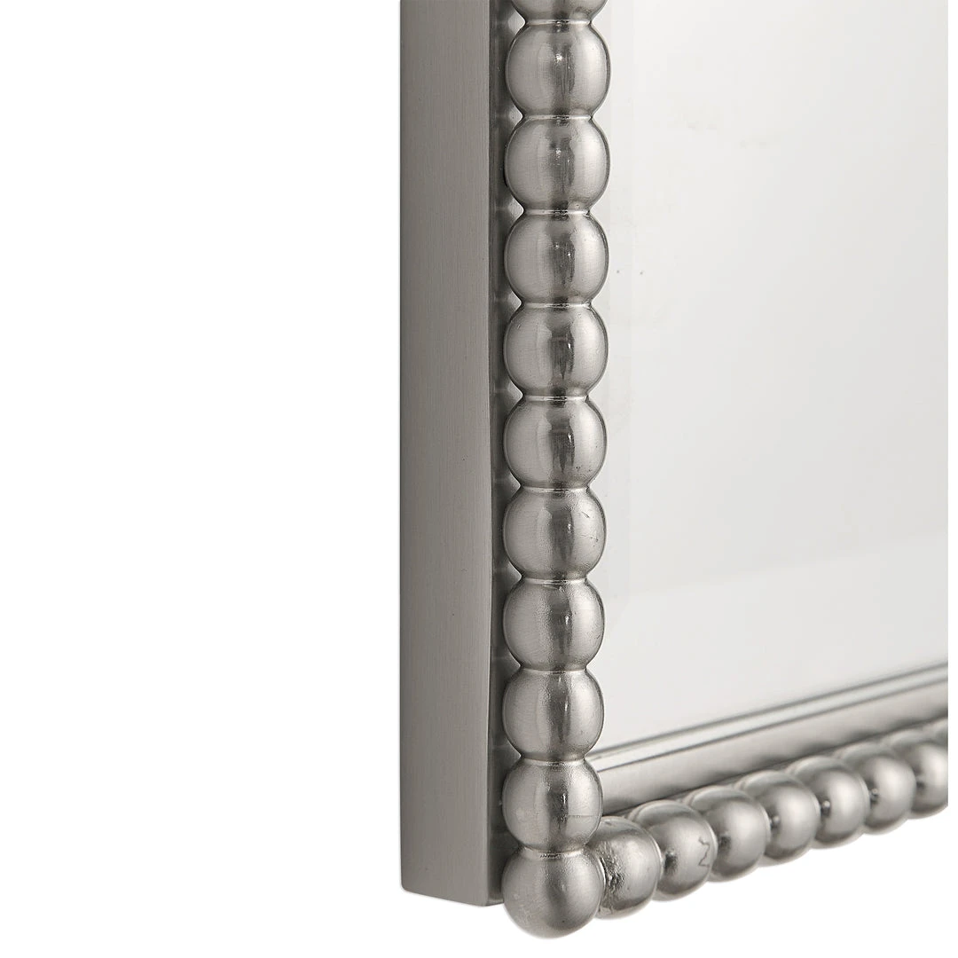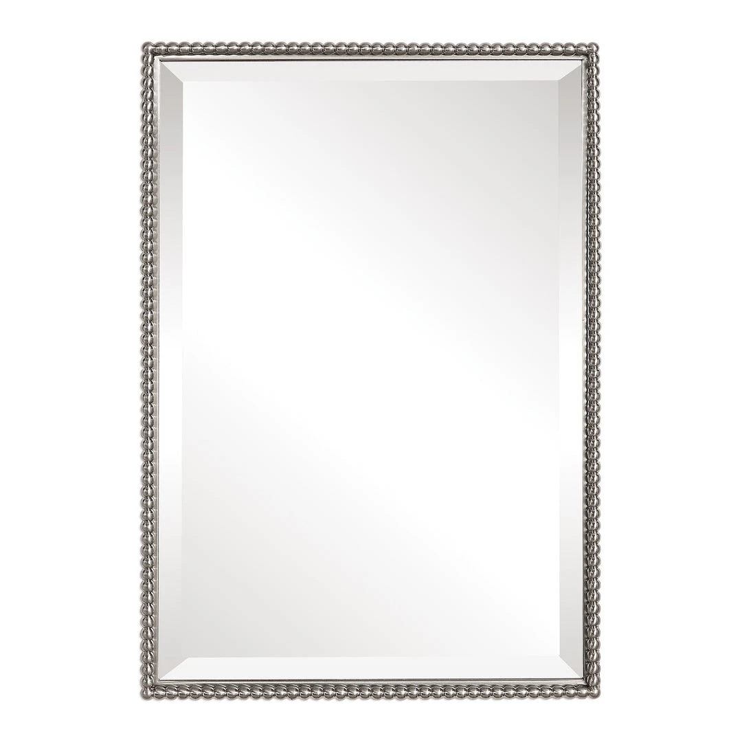 Brushed Nickel, Metal Frame Features A Decorative Beading Design. Mirror Features A Generous 1 1/4″ Bevel. May Be Hung Either Horizontal Or Vertical.