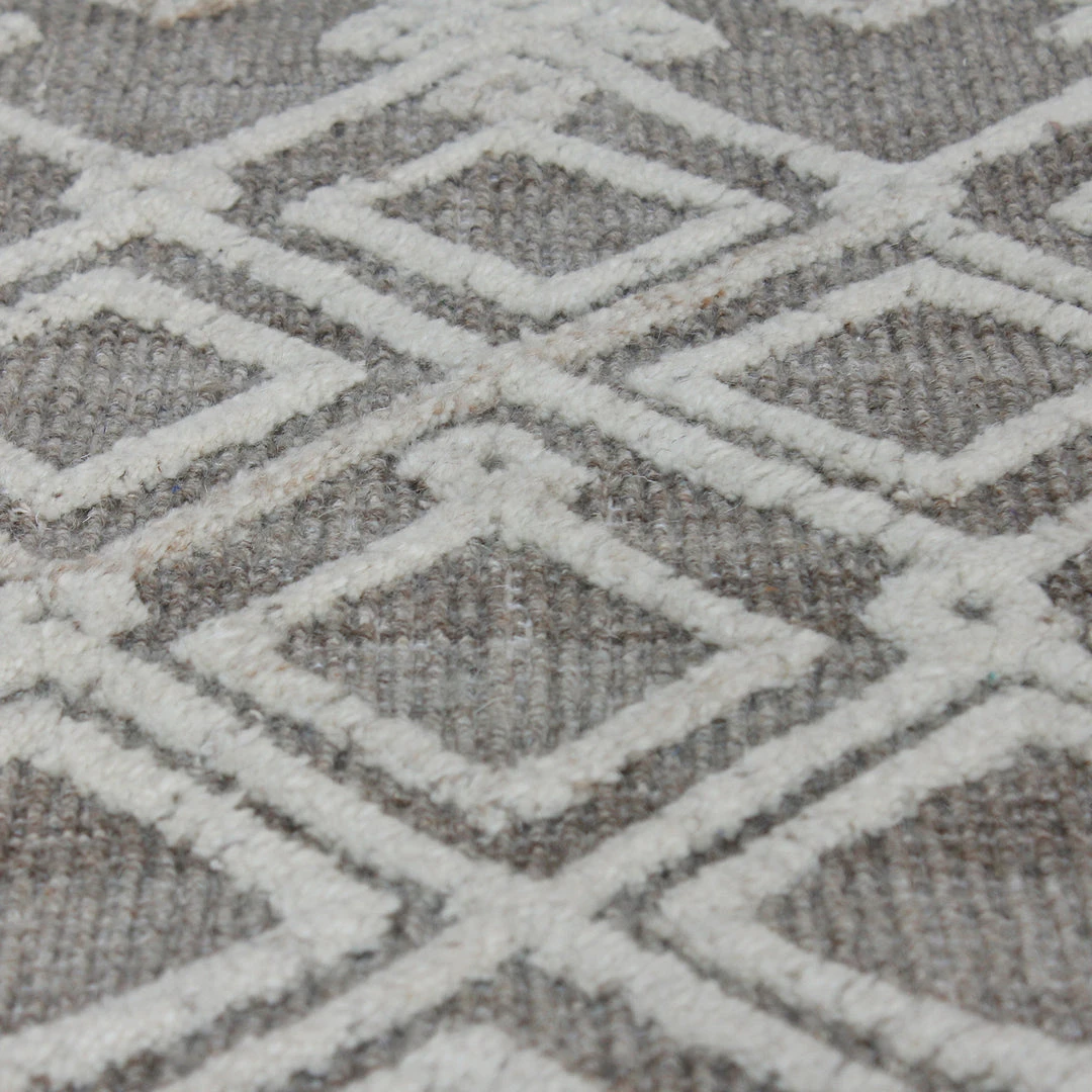 Woven natural gray wool, featuring an ivory, over tufted, tribal inspired design.