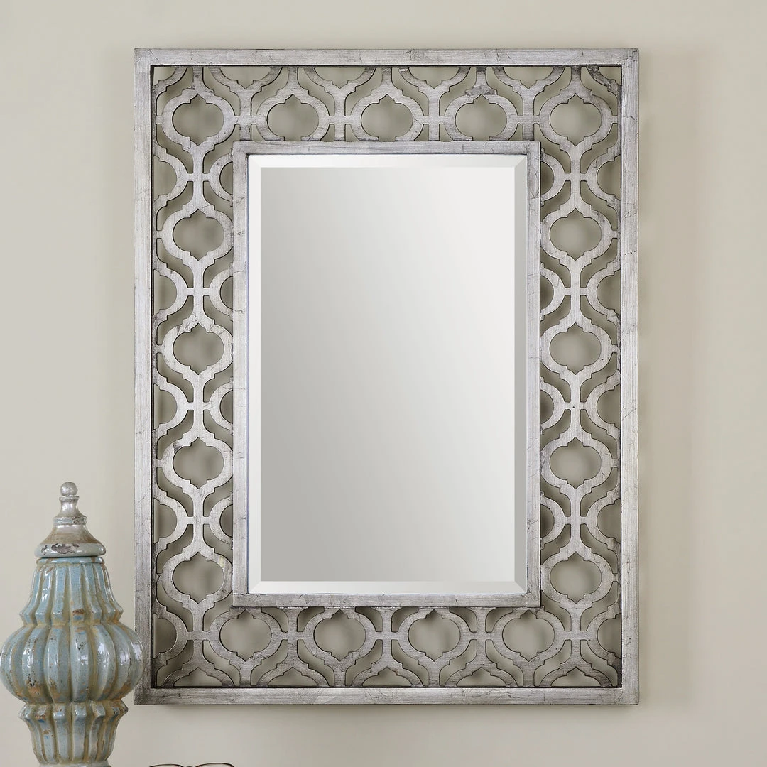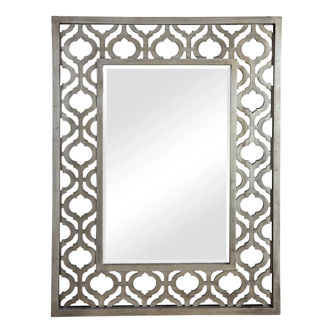 Frame Features A Decorative Design Finished In Antiqued Silver Leaf With Black Undertones. Mirror Is Beveled. May Be Hung Horizontal Or Vertical.