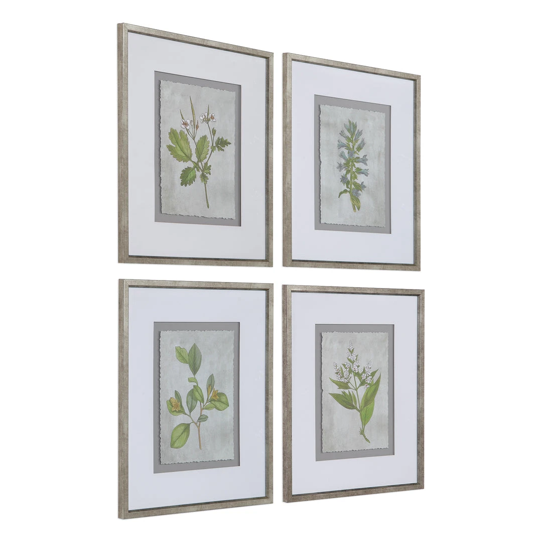 These Traditional, Floral Art Prints Feature Hand-torn Deckled Edge Detailing. Various Shades Of Green, Brown, White, Gray, Blue, And Yellow Are Shown In Each Of The Prints. The Hand-torn Prints Are Placed Against A Stone Gray Background And Are Surrounded By A Simple, Thick White Mat. Elegant Champagne Silver Leaf Frames Complete Each Botanical Print. Each Print Is Set Under Protective Glass.