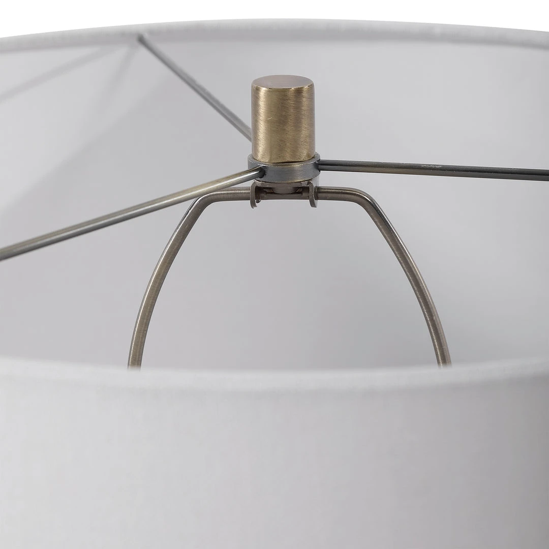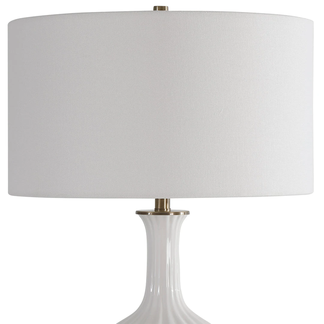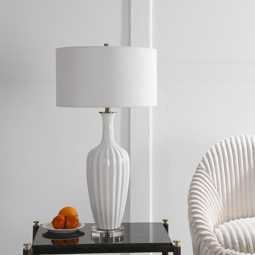 Displaying A Traditional Elegance, This Table Lamp Features A Fluted Ceramic Base In A Gloss White Glaze With Brushed Brass Plated Details And A Thick Crystal Foot. A White Linen Fabric Drum Shade Compliments The Piece.