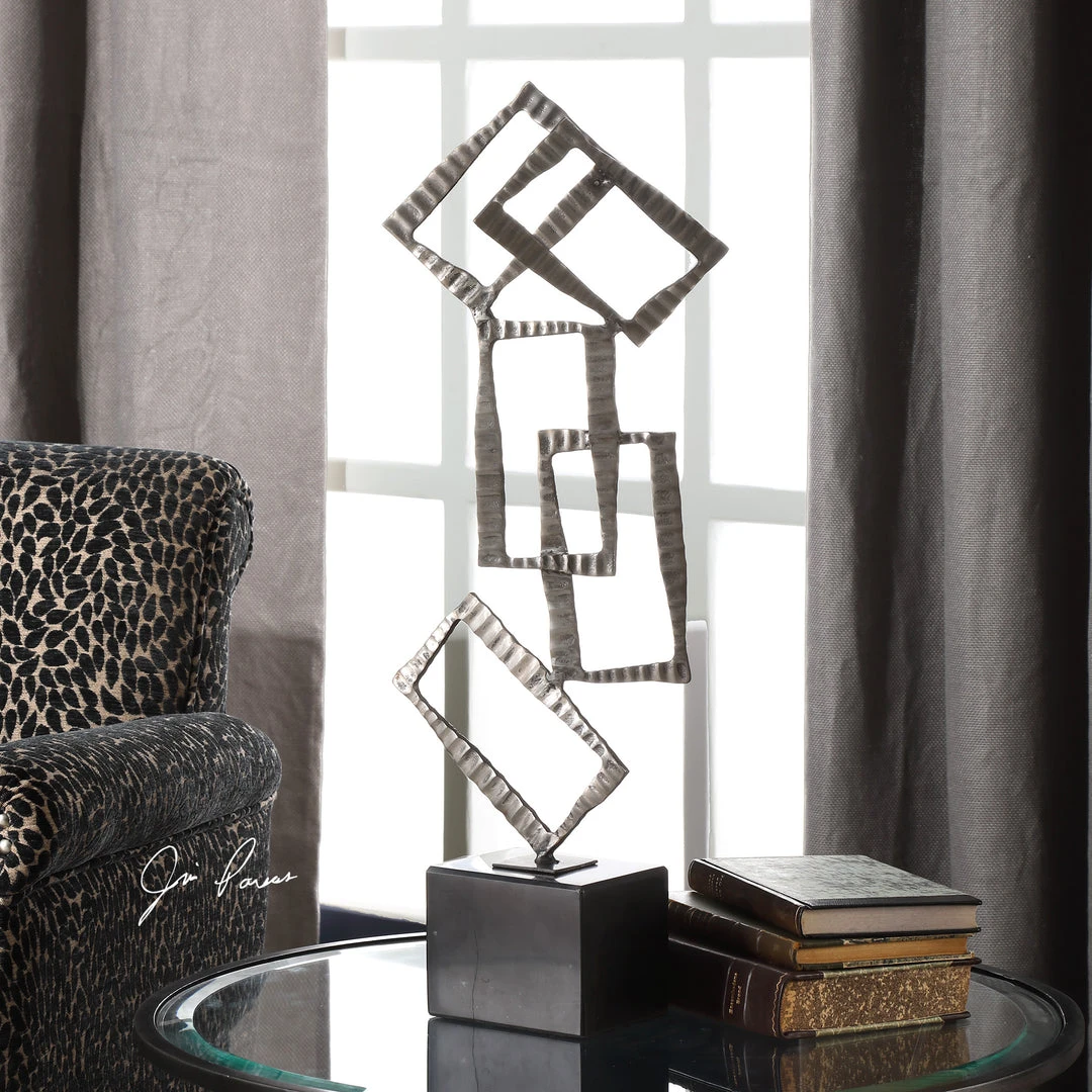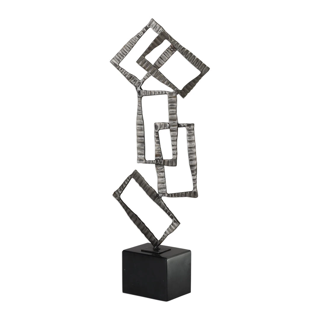 Randomly Stacked, Crimped Edge, Cast Iron Rectangles Finished In A Lightly Antiqued Brushed Nickel, Displayed On A Black Marble Base.