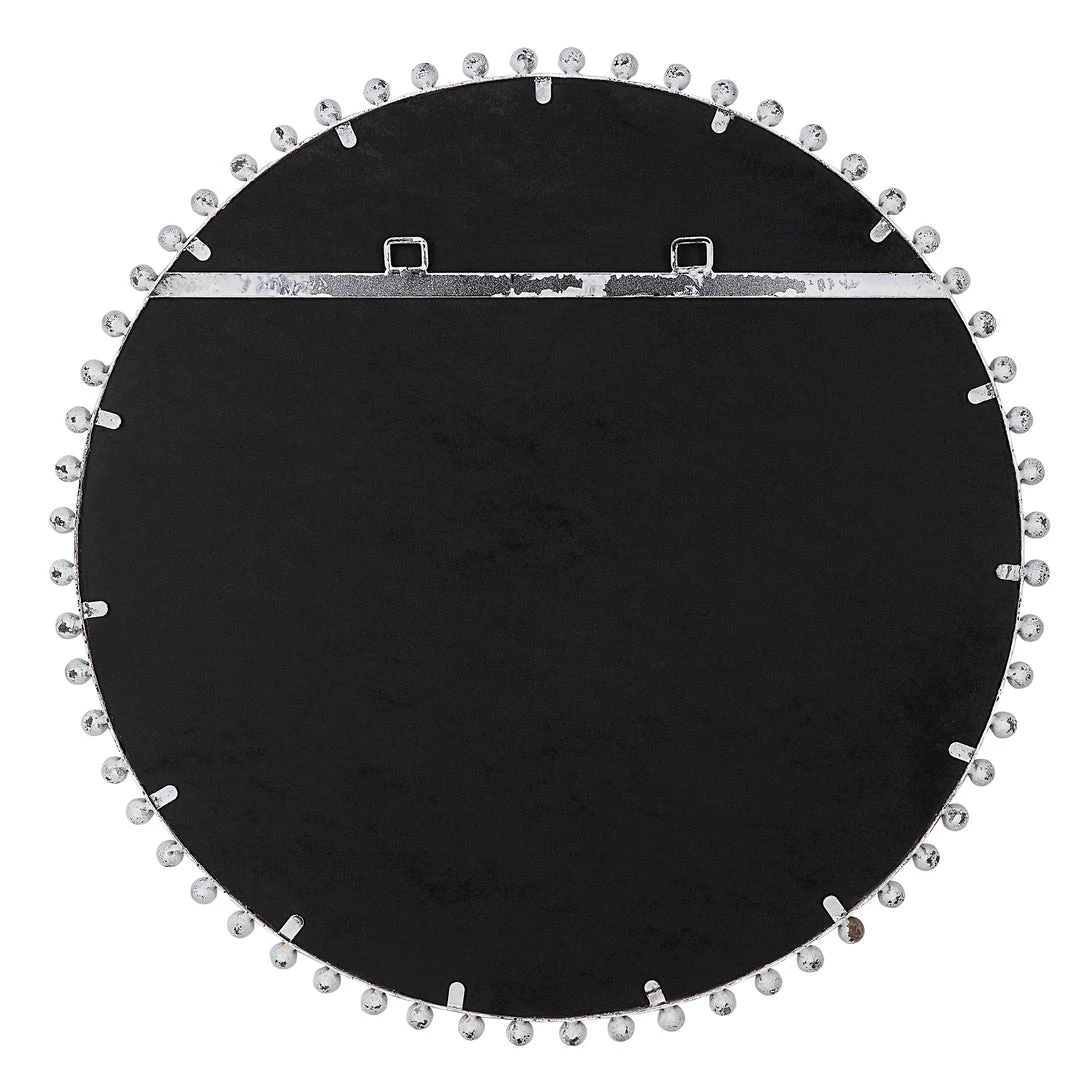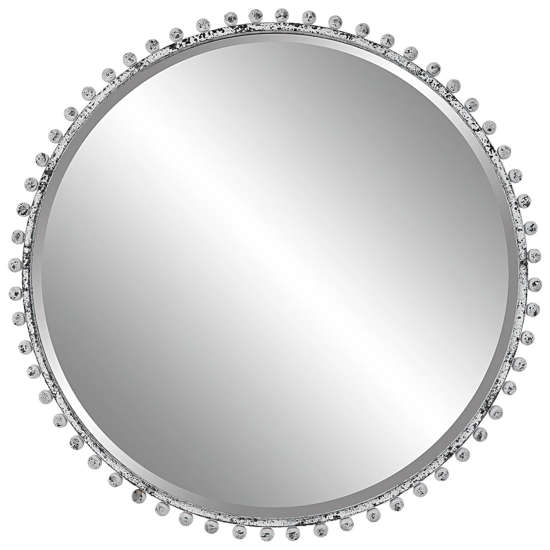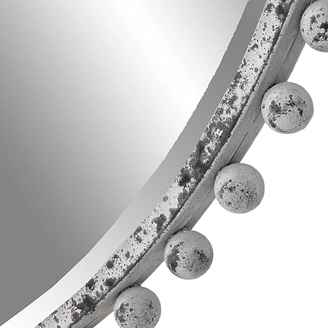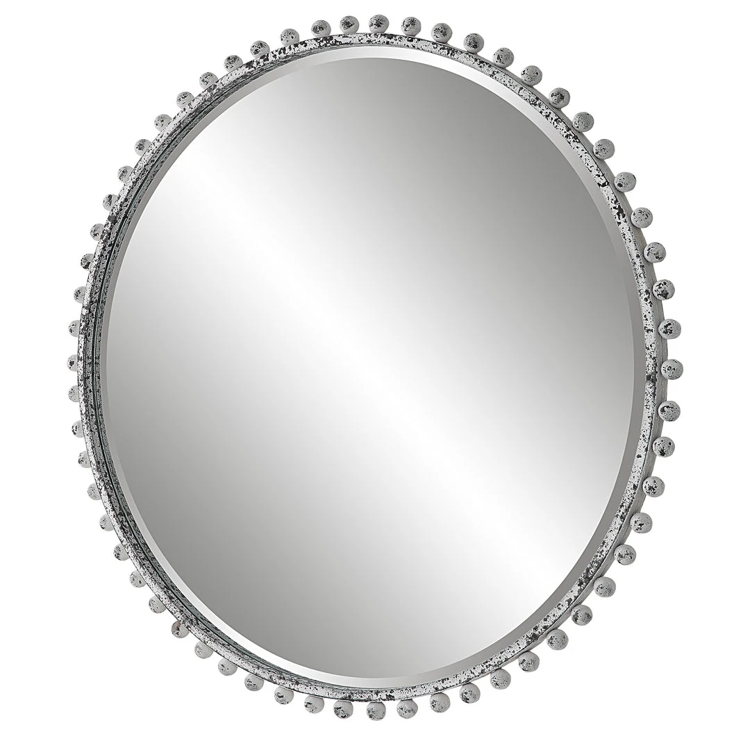 Petite Iron Spheres Line The Outer Edge Of This Round Frame, Finished In A Heavily Distressed Aged White With Rustic Black Undertones. Mirror Features A Generous 1 1/4″ Bevel.