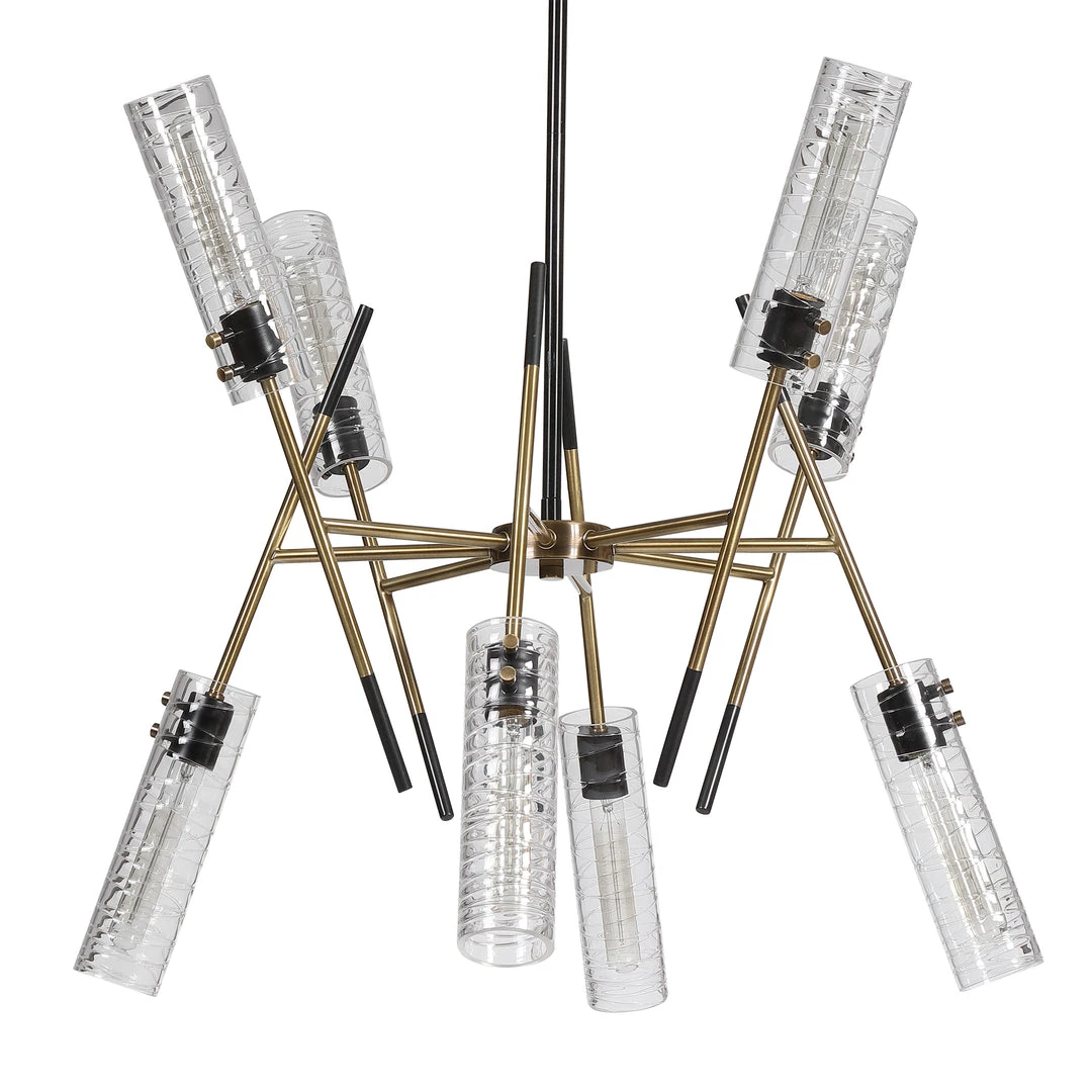 A Dramatic Soft Contemporary Look Blends Straight Lines And Linear Glass To Give Us This Eye Catching 8 Lt Pendant. Featuring A Combination Finish Of Texture Black & Antique Brass Complimenting The Narrow Clear Cylinders Of Glass With Unique Swirled Thread Accents. 8-60 Watt Max, Edison Sockets. Supplied With 15 Wire, 3-12″ Stems, And 1-6″ Stems For Adjustable Installation.
