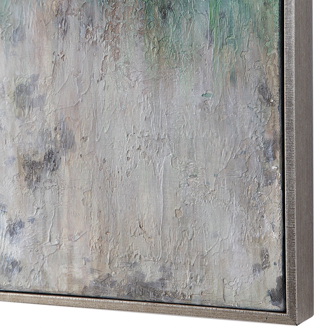 A Modern, Coastal Style Is Evident In This Hand Painted Artwork On Canvas. Heavily Textured, Each Piece Includes Shades Of Cream, Light Brown, Sea Foam Green, Gray, And Various Shades Of Blue. A Petite, Silver Leaf Gallery Frame Encases Each Piece Of Artwork. Due To The Handcrafted Nature Of This Artwork, Each Piece May Have Subtle Differences.