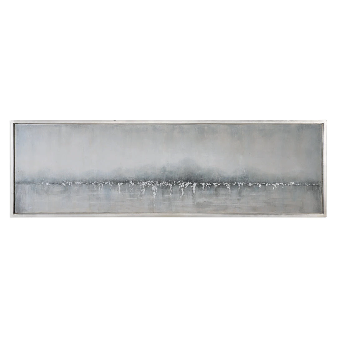 Hand Painted On Canvas, This Abstract Artwork Transcends Multiple Design Styles. A Versatile Color Palette Of Light Gray, Cream, And Icy Blue Is Complemented By Silver Leaf Accents. The Canvas Is Stretched And Applied To Wooden Stretchers Before Being Encased By A Silver Leaf Gallery Frame. Due To The Handcrafted Nature Of This Artwork, Each Piece May Have Subtle Differences.