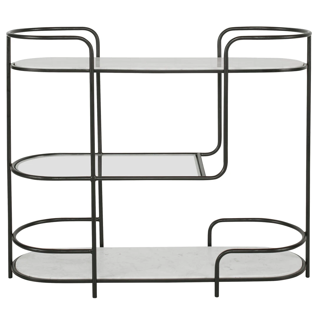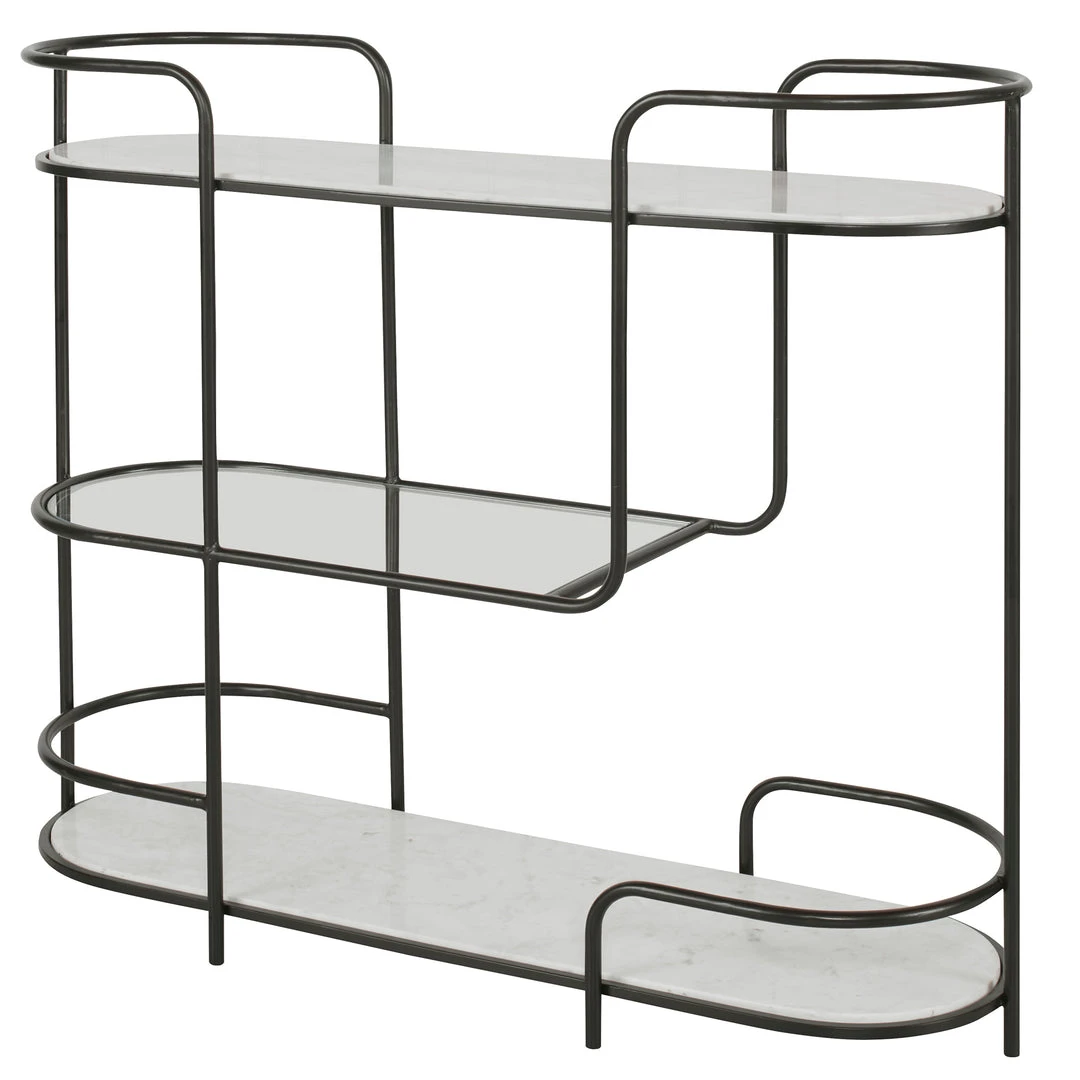 Inspired By A Mix Of Classic Mod Design And Contemporary Styling, This Multifunctional Piece Can Serve As A Bar, Server, Or Console Table. The Curved Iron Frame Is Finished In Satin Black, Accented By White Marble And Tempered Glass Shelving. Because Of The Natural Characteristics Of Marble, Each Piece Will Have Unique Veining Patterns.