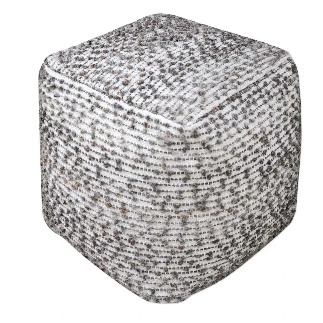 Handwoven with a neutral beige cotton, intermingled with a textured wool slubbing in contrasting gray and brown tones. Has versatile use as an ottoman, extra seating for guests, or even an accent table when topped with a decorative tray.