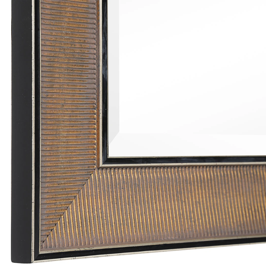 Art-deco Influences Are Displayed In This Design That Features Linear Texture Finished In Antiqued Gold With Rust Glaze Paired With Bold Satin Black And Silver Highlights. The Beveled Mirror May Be Hung Horizontal Or Vertical.