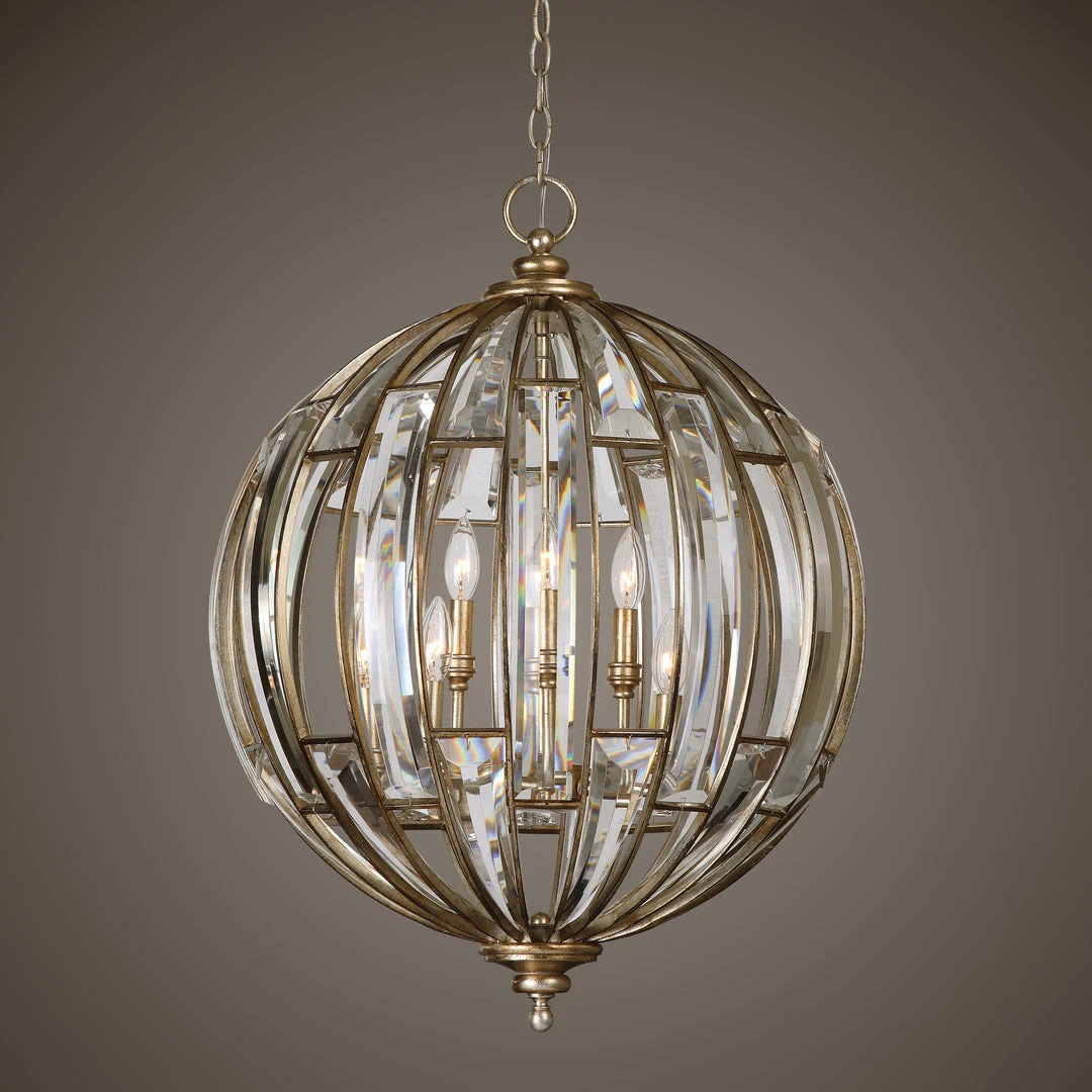 A Statement Of Sumptuous Elegance, A Sphere Of Beveled Crystals Enhanced With Burnished Silver Champagne Leaf Finish, Presenting A Modern Update Of Traditional Sophisticated Elements.