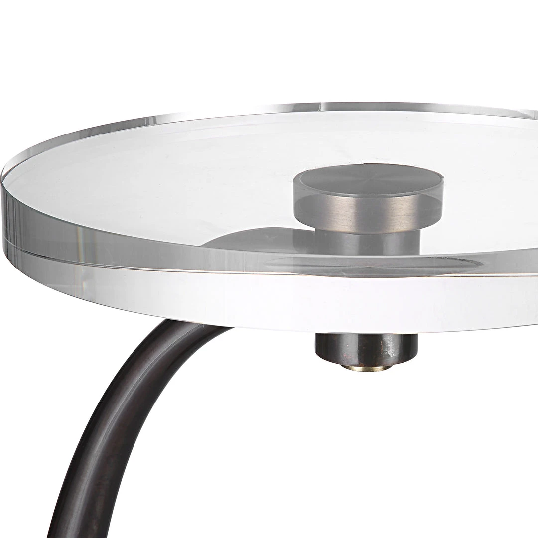 Minimal Yet Sophisticated, The Waveney Drink Table Displays A Sleek Curved Iron Base In Dark Bronze With Antique Brass Plated Accents And A Thick Crystal Top.