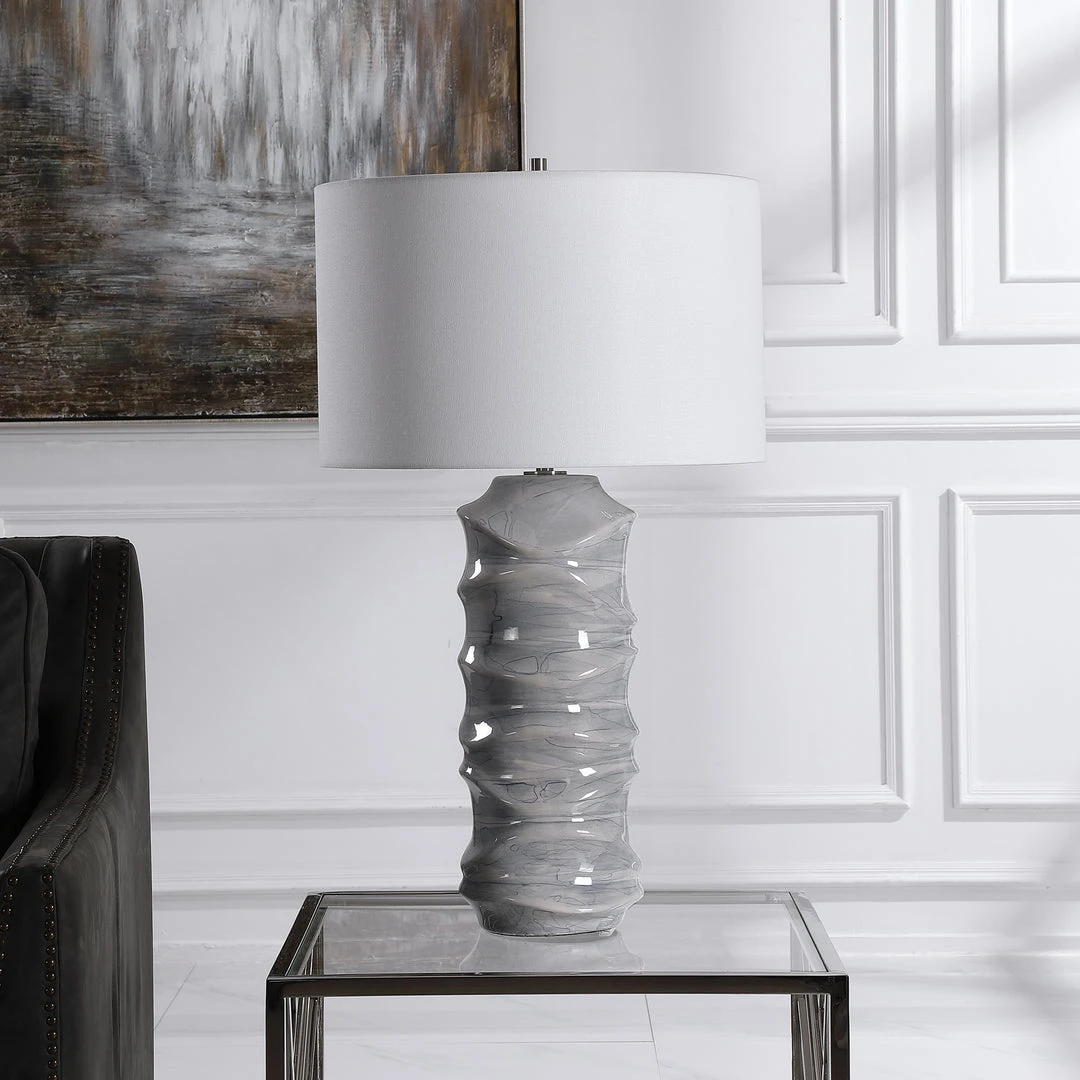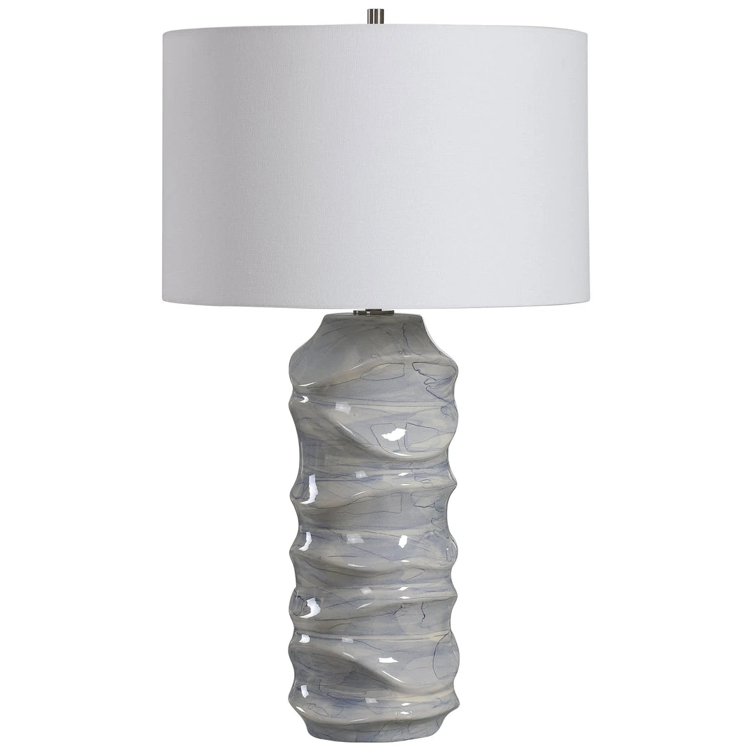 A Contemporary Take On Classic Blue And White Ceramics, This Table Lamp Features A Unique Sculpted Design With A Hand Applied Light Cobalt Blue Drip Glaze. The Lamp Is Paired With A Crisp White Hardback Drum Shade.