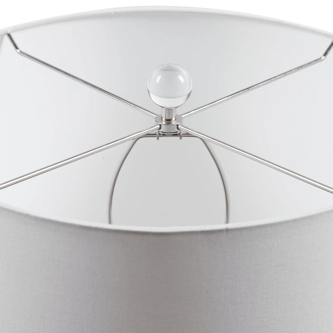 This Refined Table Lamp Features A Classic Blue Ceramic Base With White Subtle Undertones And Organic Vertical Texture, Paired With Sophisticated Polished Nickel And Crystal Accents. The Round Hardback Drum Shade In A White Linen Fabric.