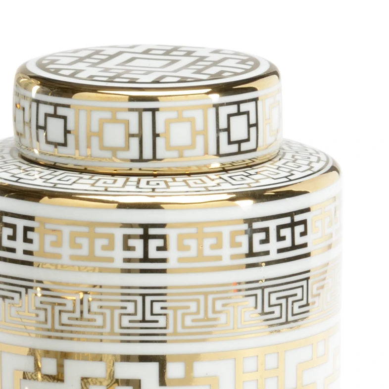 White Glaze On Ceramic With Metallic Gold Decoration, Set Of Three. Small: 6.5″H X 6″W X 6″D, Medium: 10″H X 6″W X 6″D