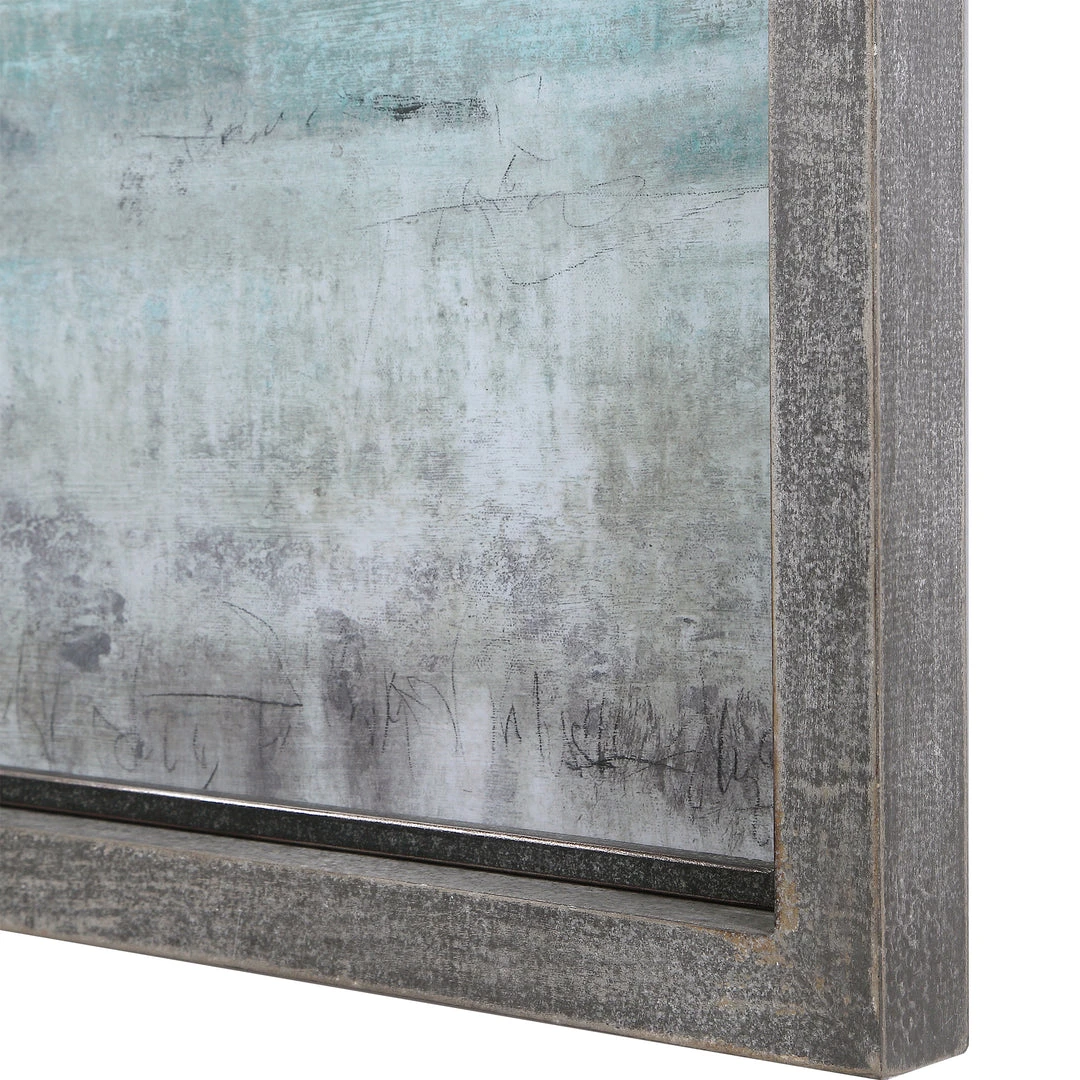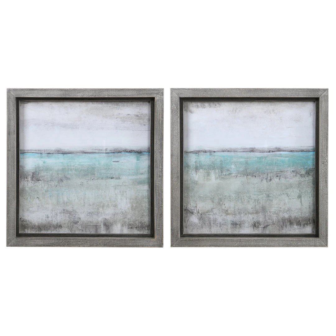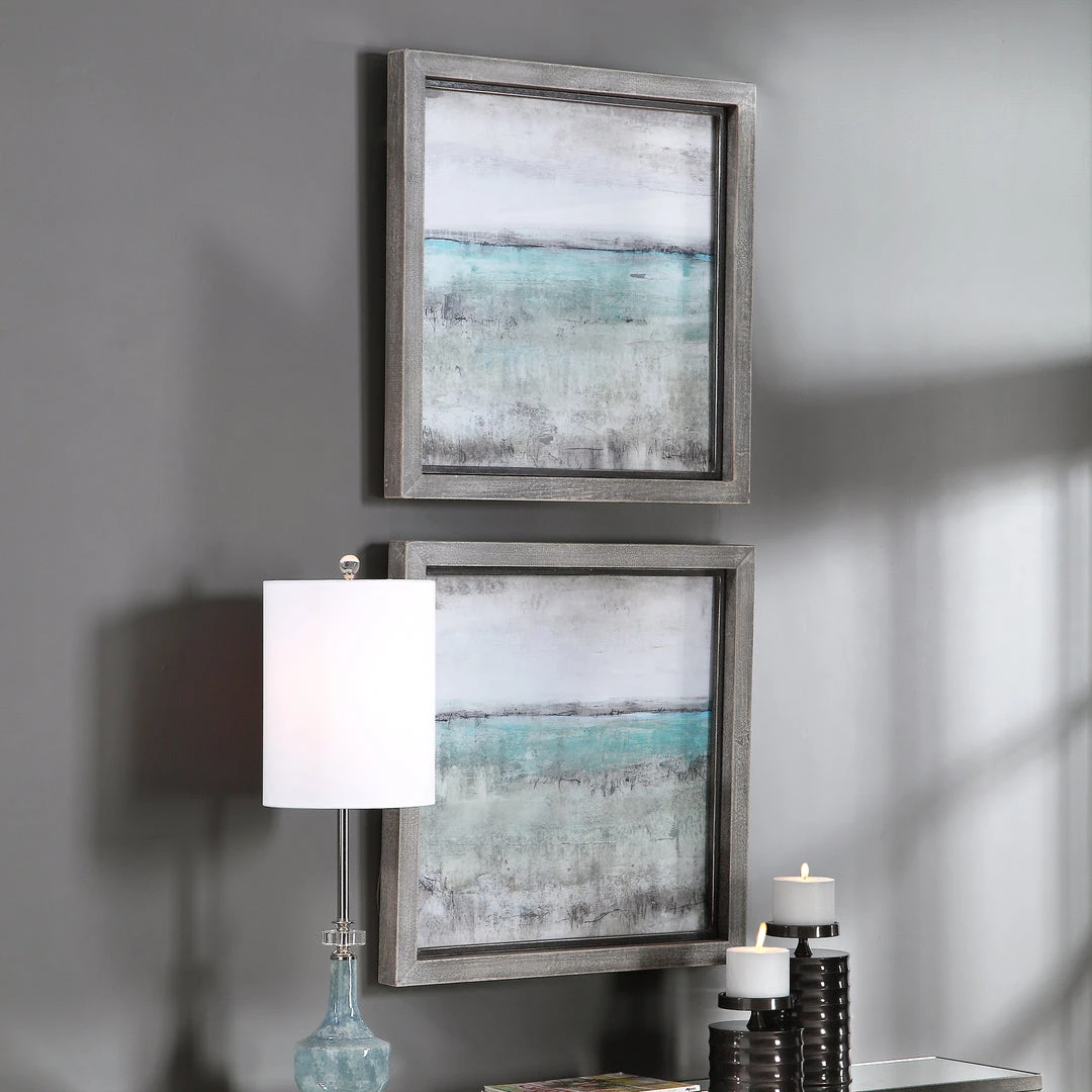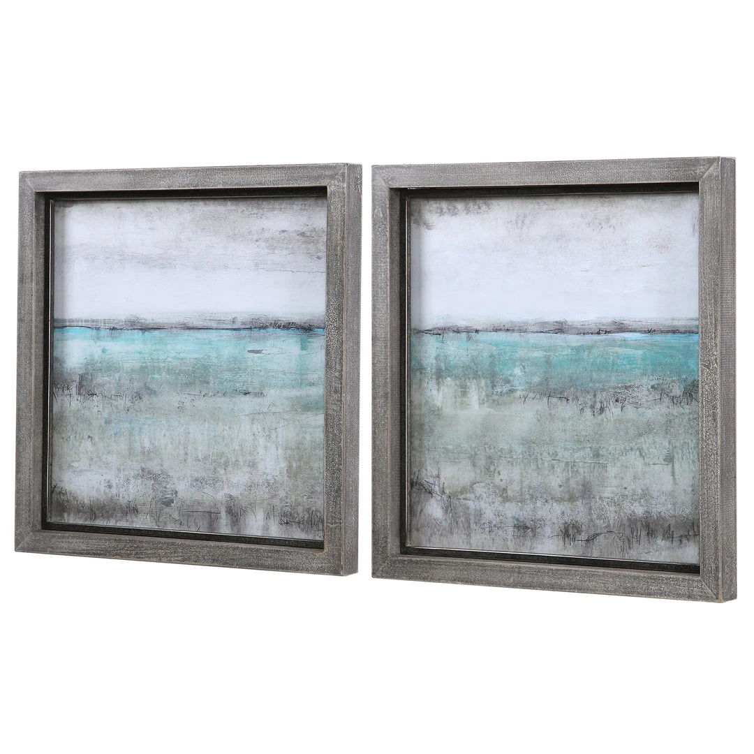 These Framed Landscape Prints Showcase Shades Of Aqua, Sea Foam Green, Light Gray, And Ivory With A Rustic Gray Frame Accented By Heavy Distressing And A Bronze Inner Lip. Each Print Is Placed Under Protective Glass.