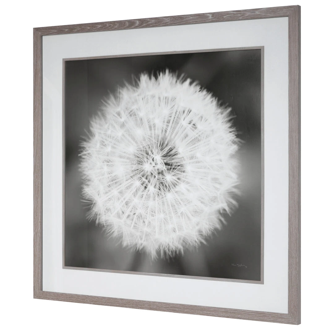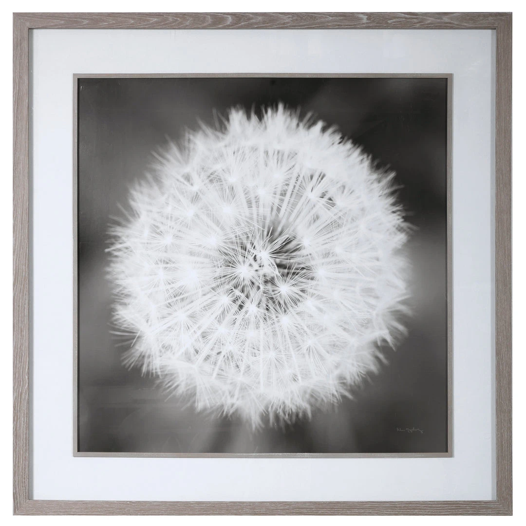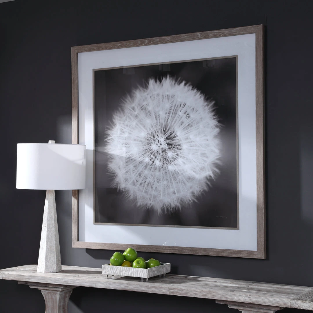 This Black And White Dandelion Framed Print Is A Great Neutral Piece Of Artwork That Adds Interest To Any Space. The Print Is Accented By A Driftwood Gray Pine Wood Frame With A Matching Fillet And A Large White Mat.