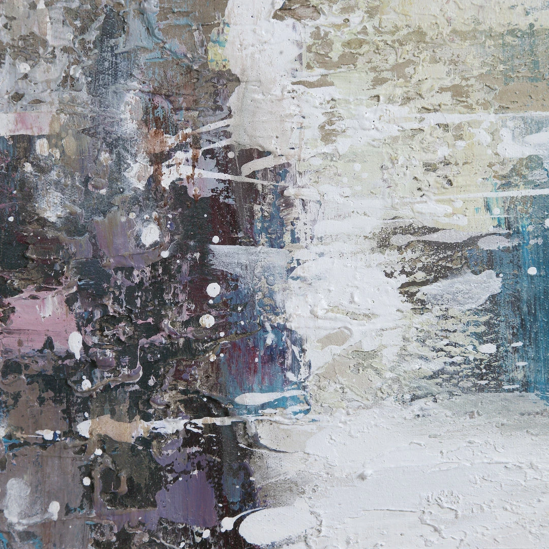 Hand Painted Artwork On Canvas Exhibits An Array Of Color Including Lavender, Aqua, White, And Tan. A Gold Leaf Gallery Frame Completes The Abstract Piece, Which May Be Hung Horizontal Or Vertical.