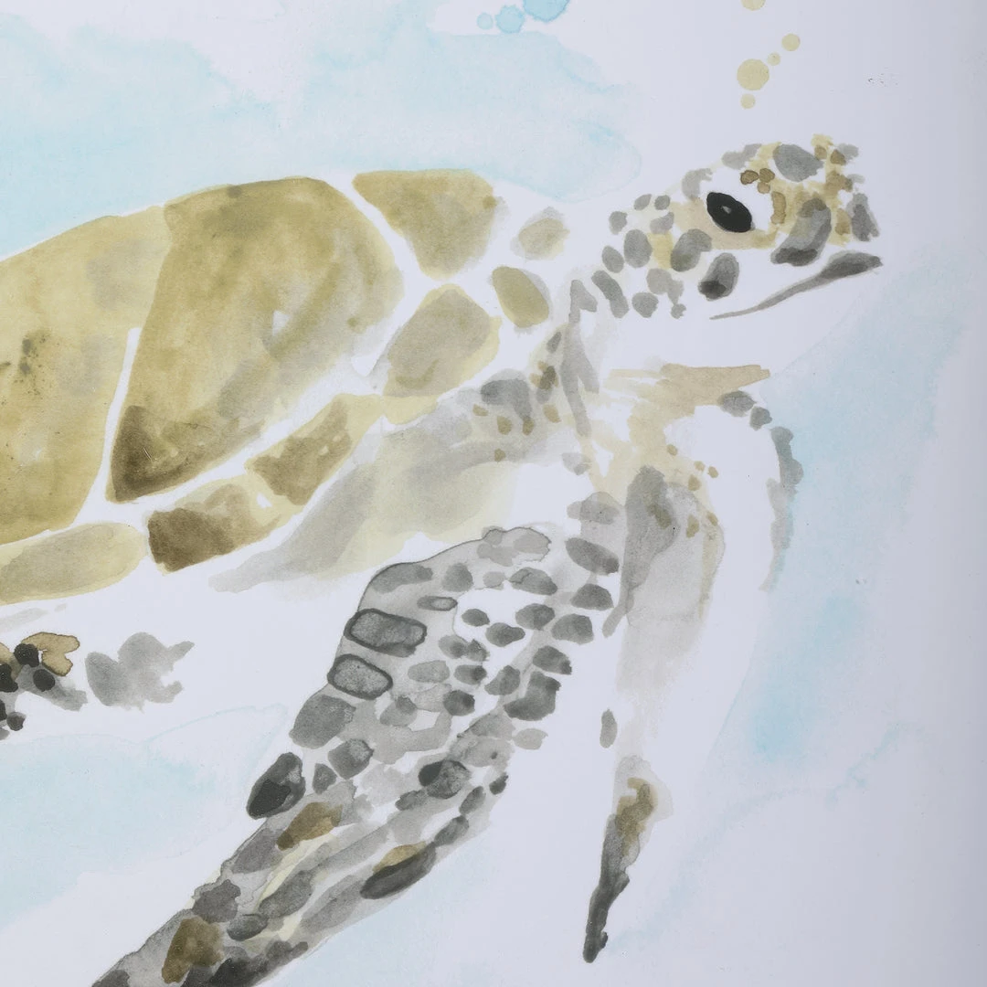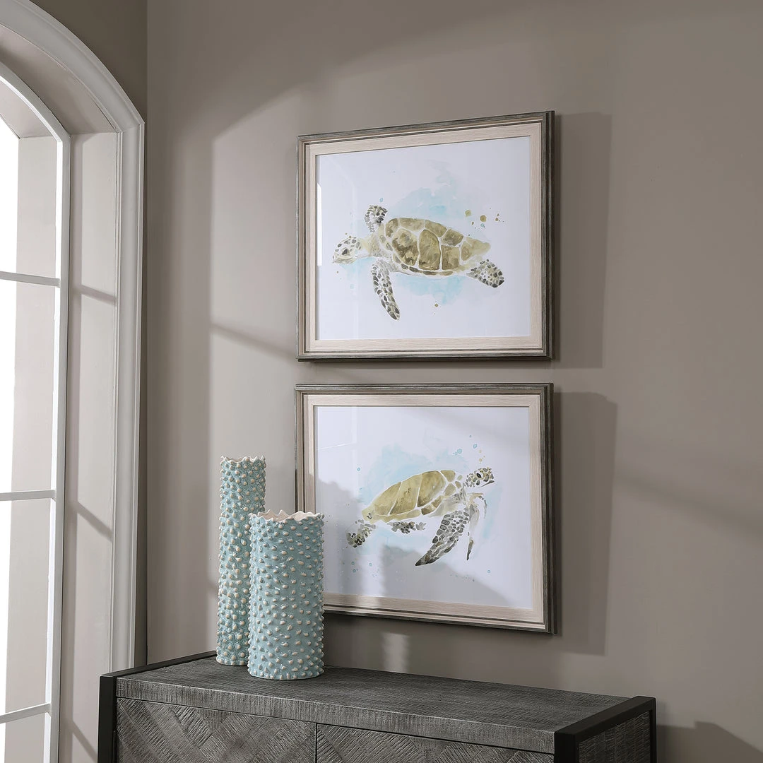 These Fun Coastal Accents Add A Whimsical Flair To A Design While Still Retaining A Refined Look. Each Sea Turtle Is Created In A Watercolor Style With Shades Of Ocean Blue, Charcoal, And Sage Green. A Light Wood Tone And Distressed Gray Dimensional Frame Accents Each Piece Of Art. Each Print Is Placed Under Glass.