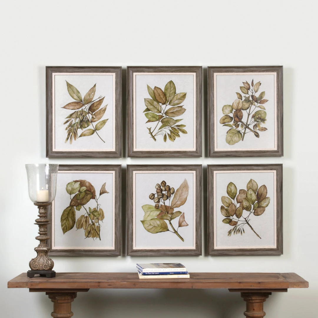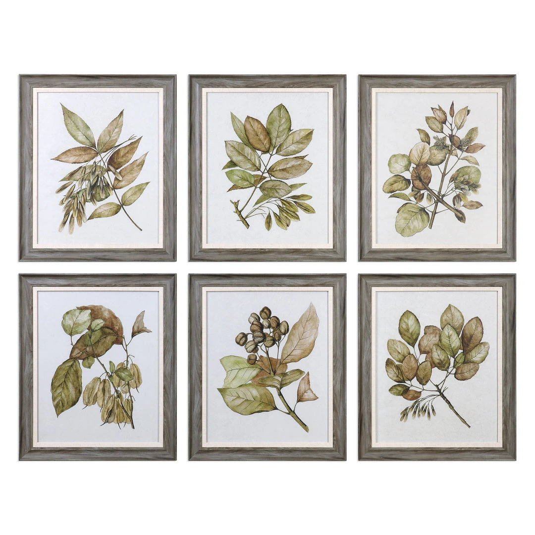 Straying From The Classic Botanical Print, This Art Set Evokes A Masculine Style. Each Is Printed On Parchment Paper And Showcases Khaki Green And Brown Tones. Wood Toned Frames With Gray Undertones Complete Each Print, And Are Accented By Ivory Linen Fillets. Each Print Is Placed Under Protective Glass.