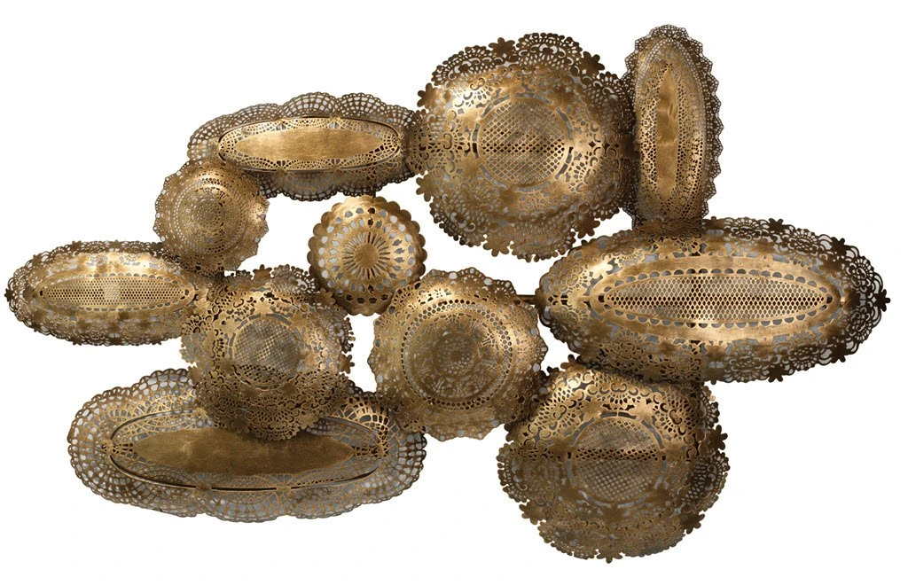Decorative wall art inspired by feather light lace patterns reimagined in ornate metal work.