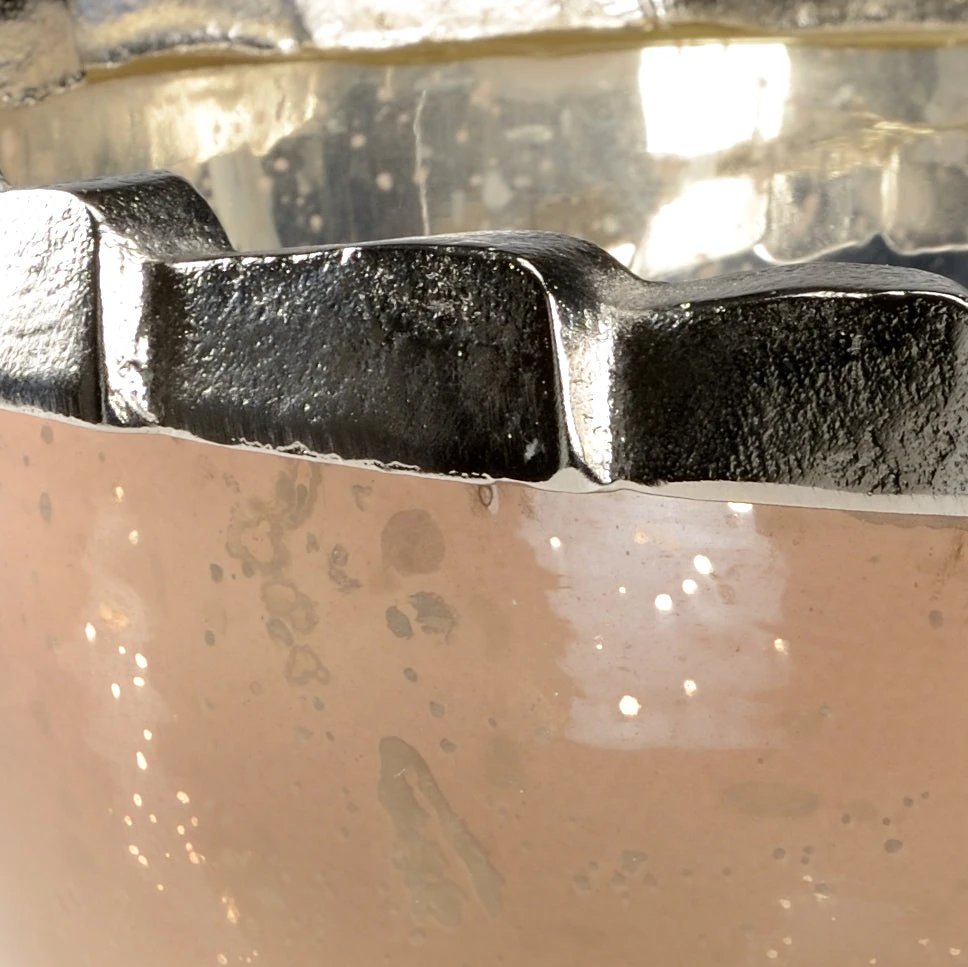 Add A Touch Of Elegance To Your Living Or Dining Area With This Stunning Art Glass Bowl. Featuring A Champagne Finished Glass And Cast Aluminum Rim, This Bowl Is A Unique Addition To Any Decor.
