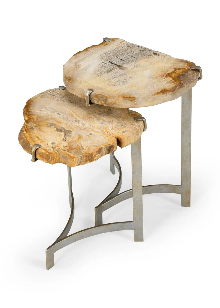 Solid Slab Of Petrified Wood Tops On Nested Set Of 2 Tables, Antique Silver Leaf Finish On Bases. Small Table 15!W X 14!D X 19!H