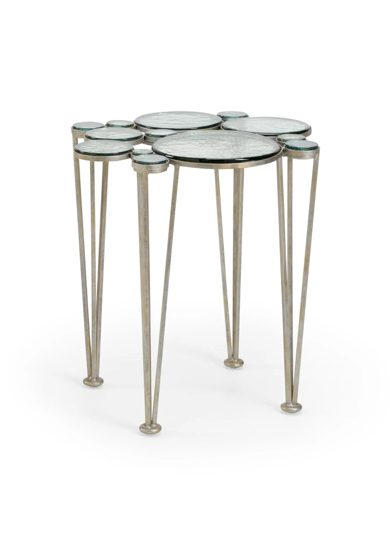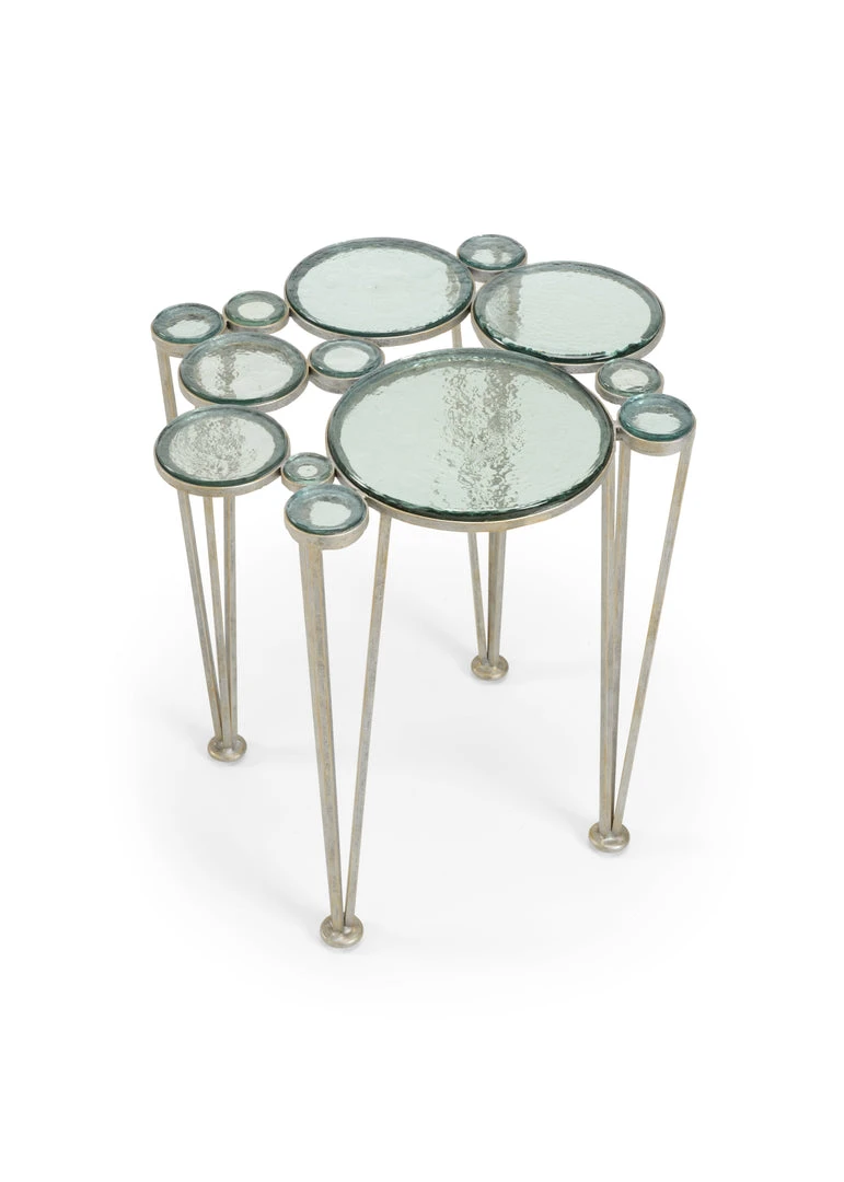 Handmade Iron And Recycled Green Glass Side Table. Antique Silver Finish.