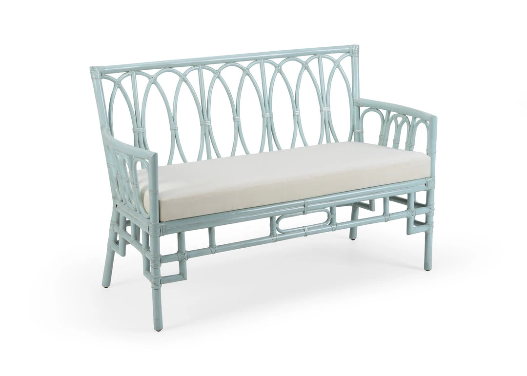 Mint finish on rattan settee with attached off white fabric cushion.