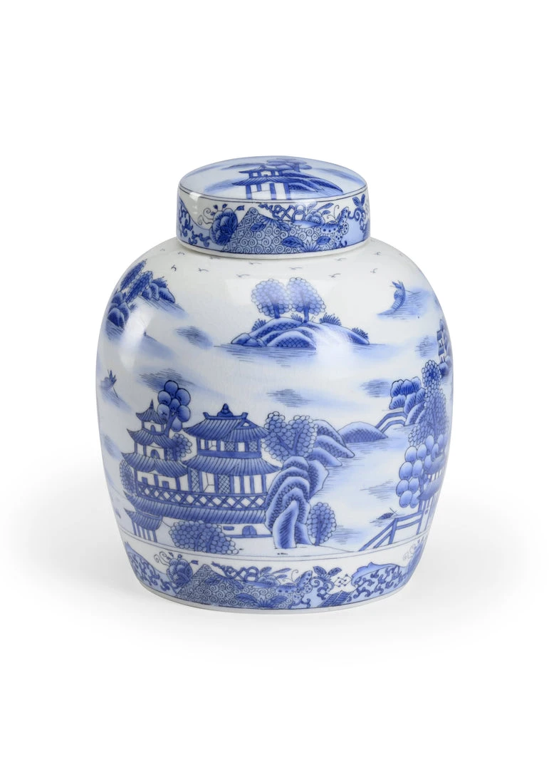 White Glaze On Ceramic Covered Jar With Hand Painted Blue Asian Design.