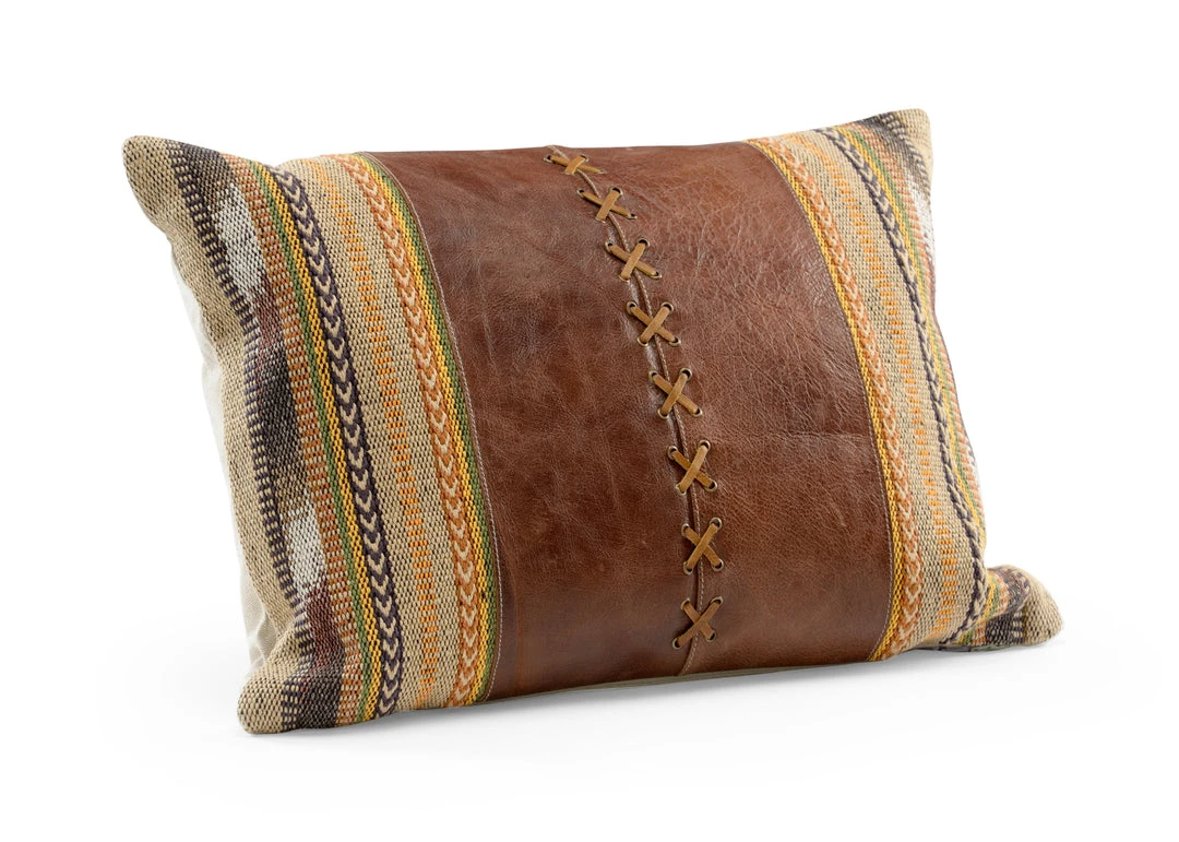 Hand Loomed Tapestry Fabric With Tan Leather Center And Lacing Natural Linen Backing With Side Zipper And Down And Feather Pillow Insert