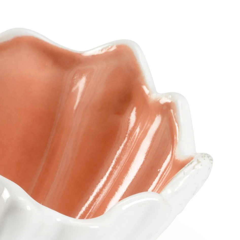 Decorative White Italian Ceramic Shell Bowl With A Coral Glazed Inside.