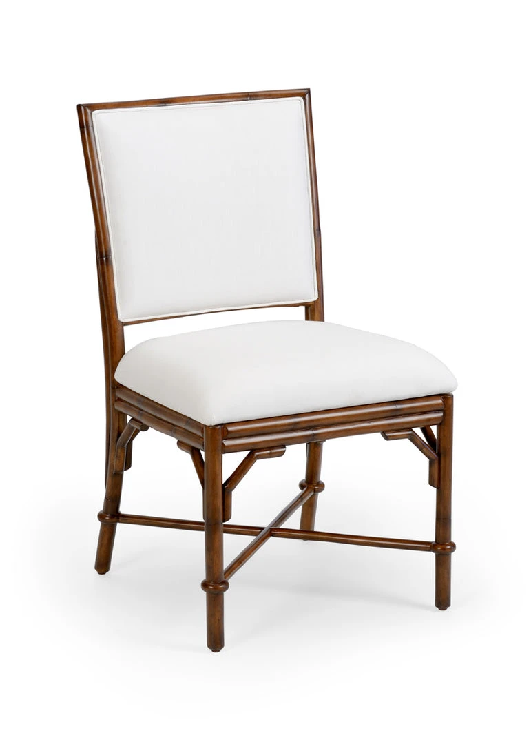 Brown finish on rattan chair with off white woven fabric cushions.