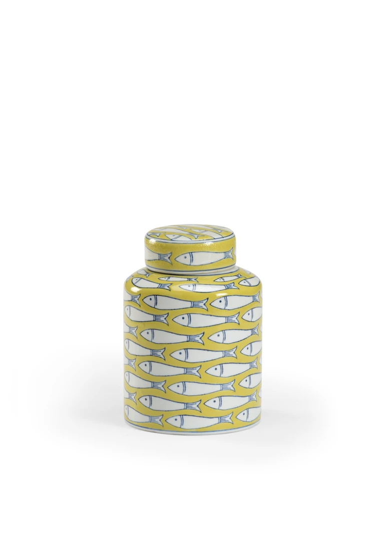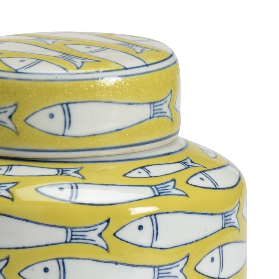 Mustard Glaze On Ceramic Canister With Fish Design In White And Blue